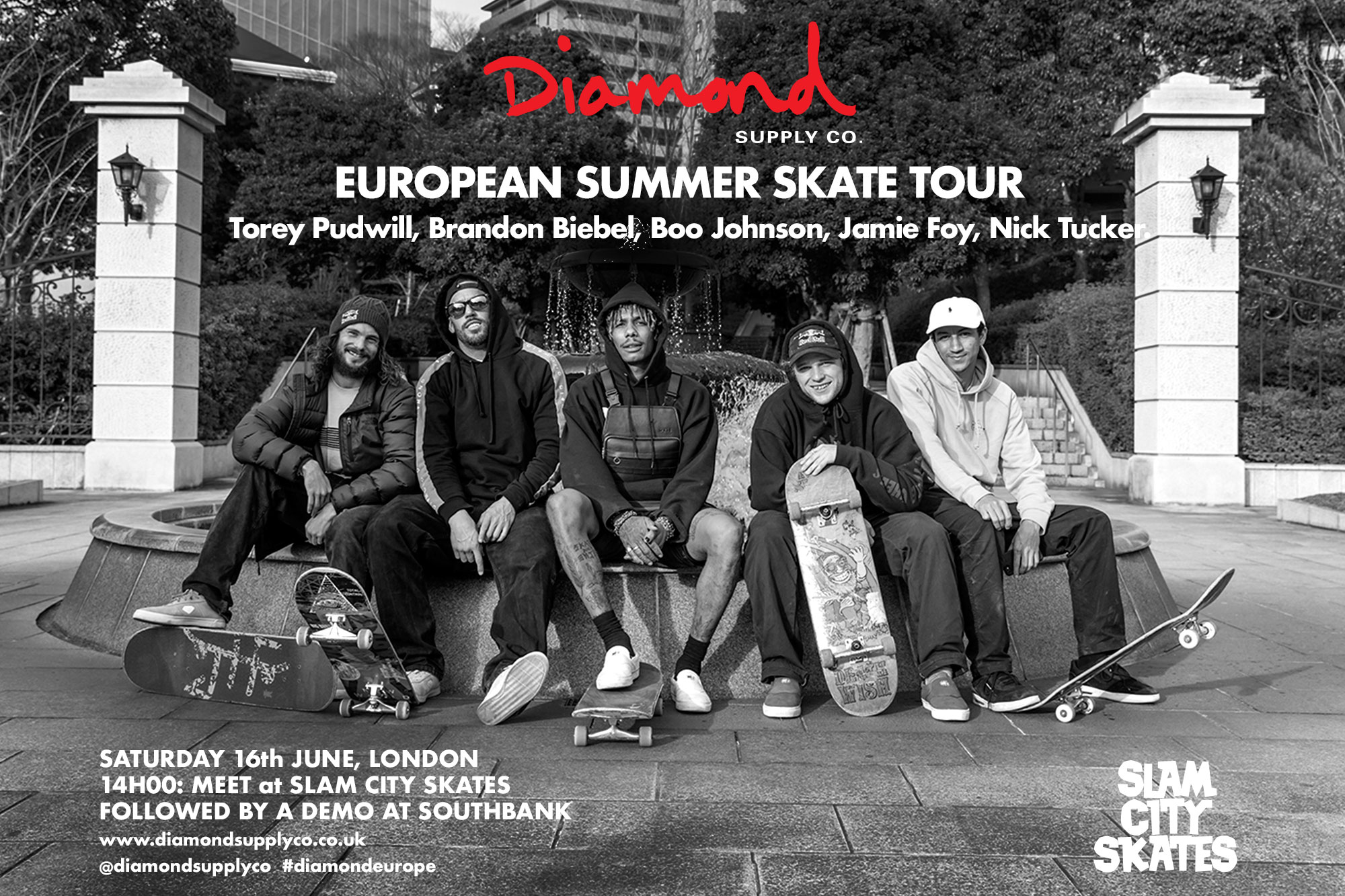 The team will be giving away Diamond Supply Co gear at all session, so get in early to avoid missing out. — For full dates and details on where and when the Diamond Footwear team will be around throughout their Summer Tour, check out diamondsupplyco.eu and follow @diamondsupplyco on Instagram.