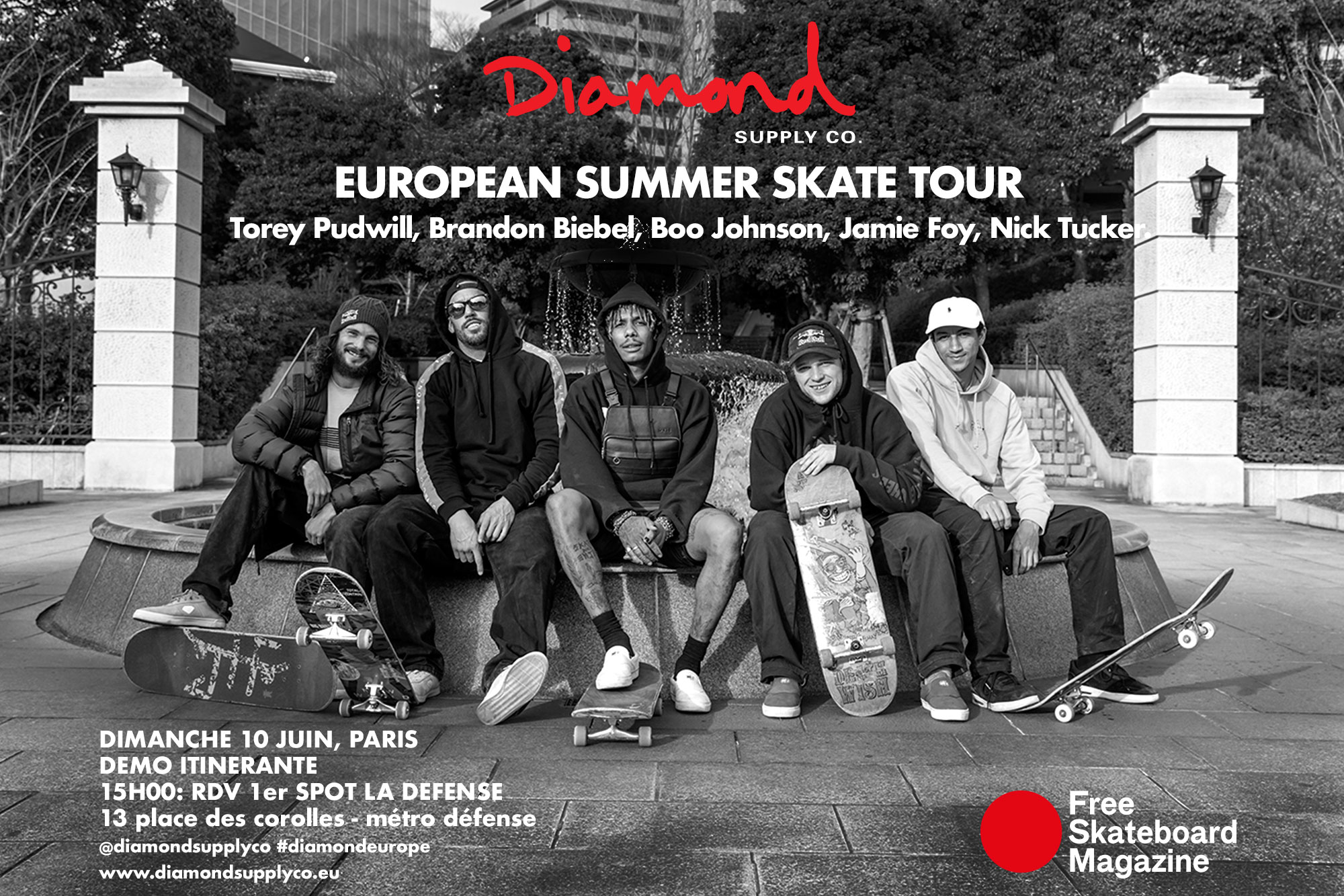 This June, Diamond Footwear’s Pro Team will descend on Europe for their Summer Skate Tour with two weeks of skateboarding, demos, and meet & greets. The tour, featuring Thrasher Skater of the Year and newest Diamond Footwear recruit, Jamie Foy, along with heavyweights Torey Pudwill, Boo Johnson, Brandon Biebel and Nick Tucker, will take over some of France and the UK’s premier skate spots to demo their skills and hang out with the local skate community.