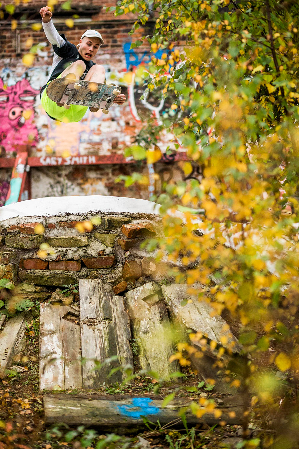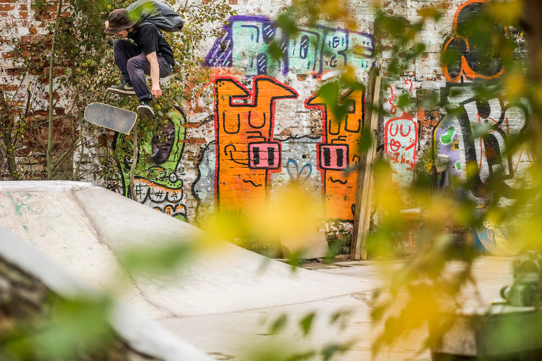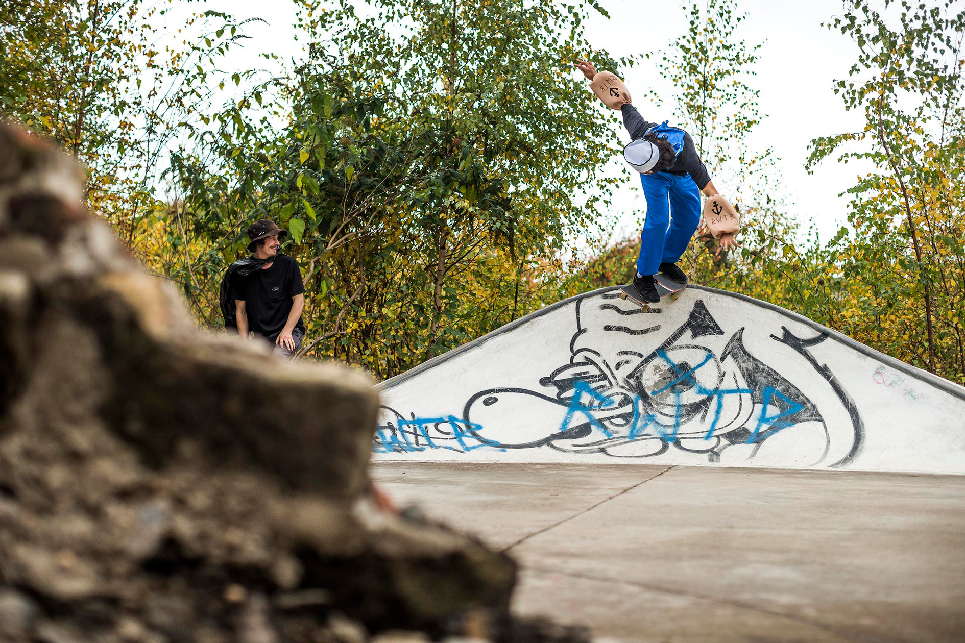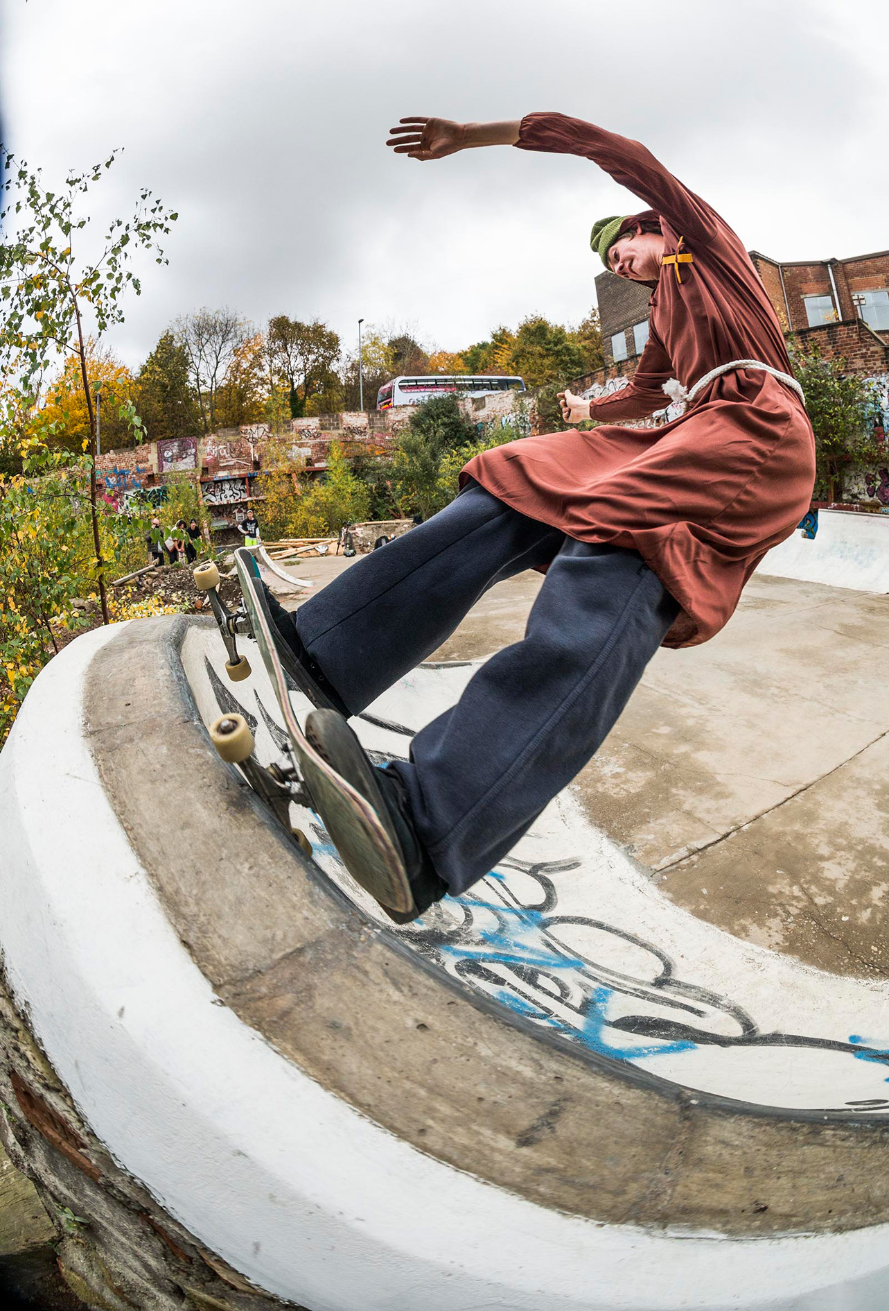 Foz dons his bin bag cap and kickflips the hip - photo Reece
