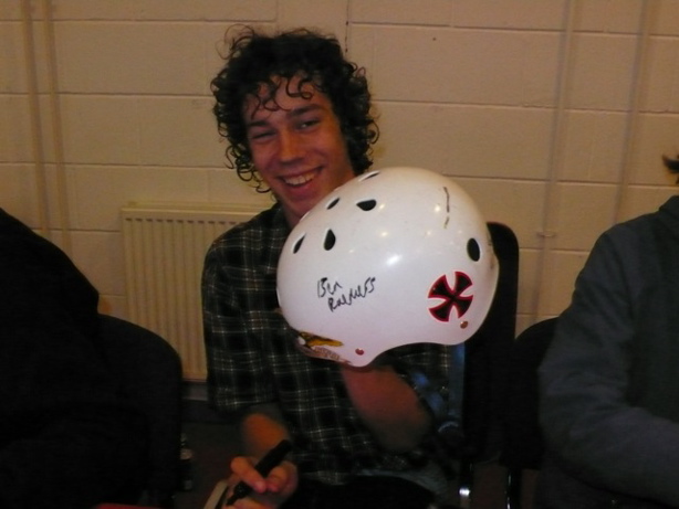 Raemers signs a child's helmet - in breach of health and safety laws.