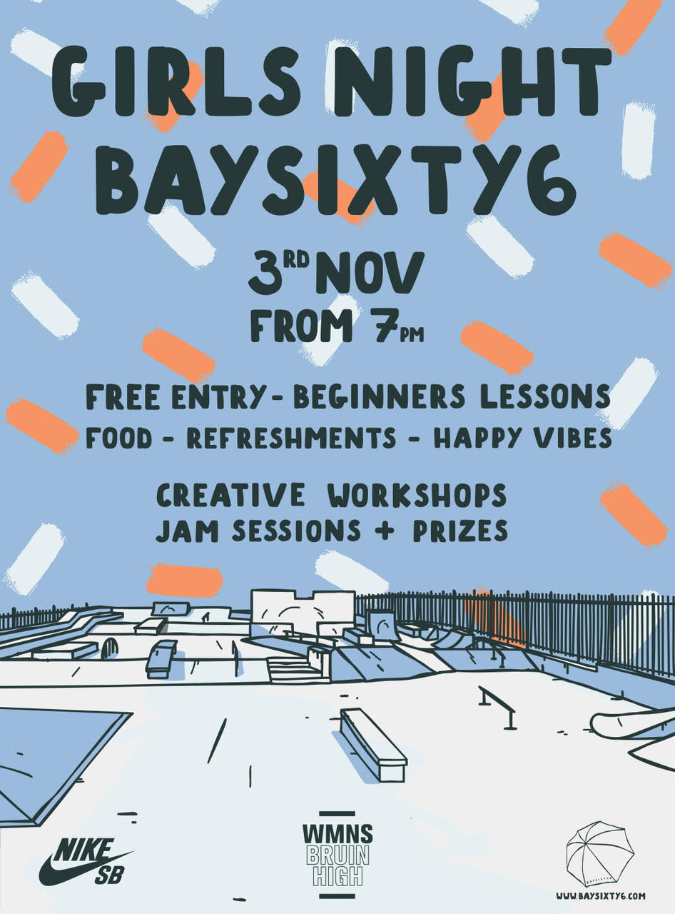 Continuing the success of the Nike SB Girls Skate Night held on the 1st Friday of the month at BaySixty6 skatepark in West London – the 3rd of November sees an injection of additional energy and entertainment to regular proceedings.