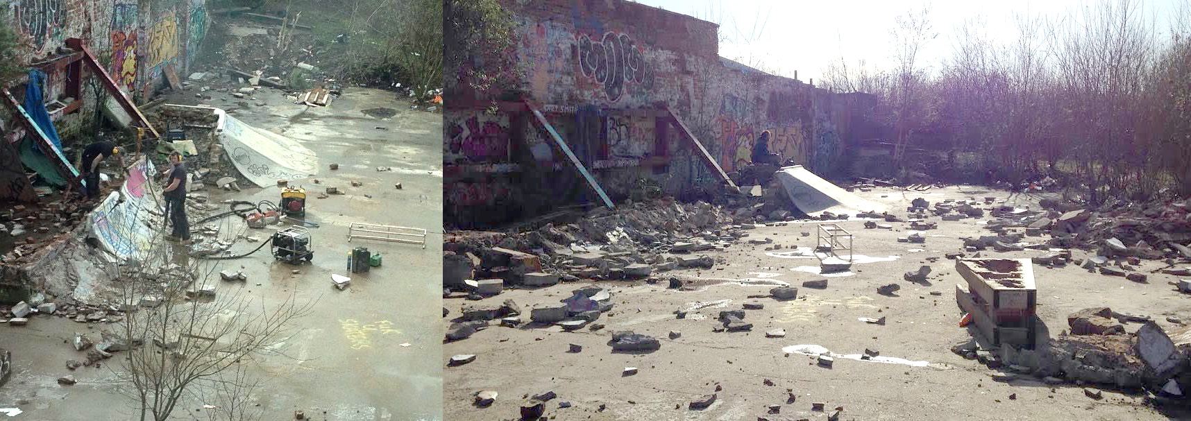 Yesterday the sad news came to us through Instagram that the Dustbowl has now joined Needleside and The Joint on the list of Leeds DIY skatespots which are no longer with us. Photos of workmen with tools were followed by ones of rubble strewn ground where there used to be quarterpipes and eventually a clip or two of the crew skating the remnants and giving it a boozed up wake.