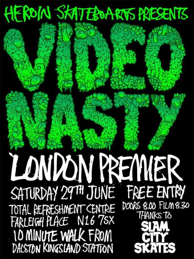 ‘Video Nasty, the long awaited new offering from Fos’ Heroin Skateboards outfit, will be getting its Big Smoke airing on Saturday evening, with an 8pm screening at The Total Refreshment Centre, N16.