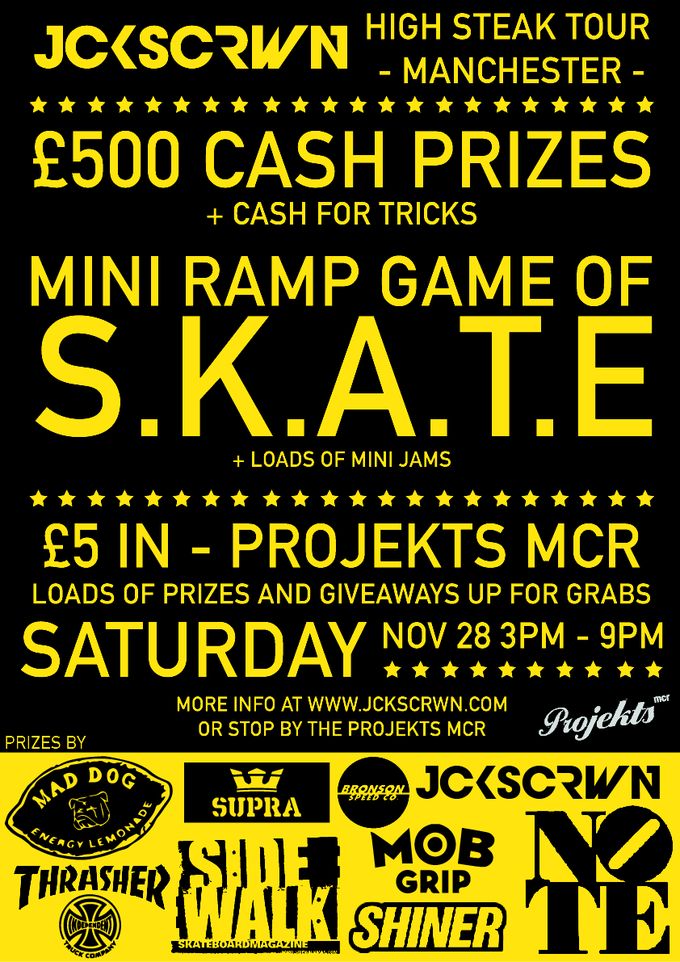 Manchester will be hit by the JCKS CRWN High Steak Tour on Saturday November 28th, in the form of a miniramp game of S.K.A.T.E. at Projekts MCR. With £500 up for grabs and plenty of cash for tricks type business running alongside the actual game, this one is definitely worth checking out if your in the Manchester area…