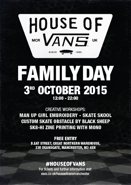 House of Vans are heading North to Manchester for a weekend of skating, music, workshops and various other events in conjunction with Black Sheep Skateshop. Check out the flyers and schedule below, and head down if you’re in the area…