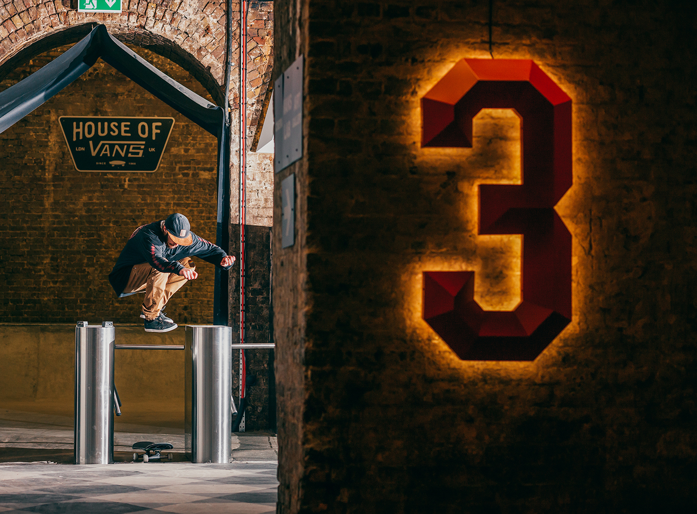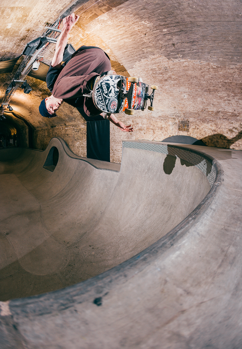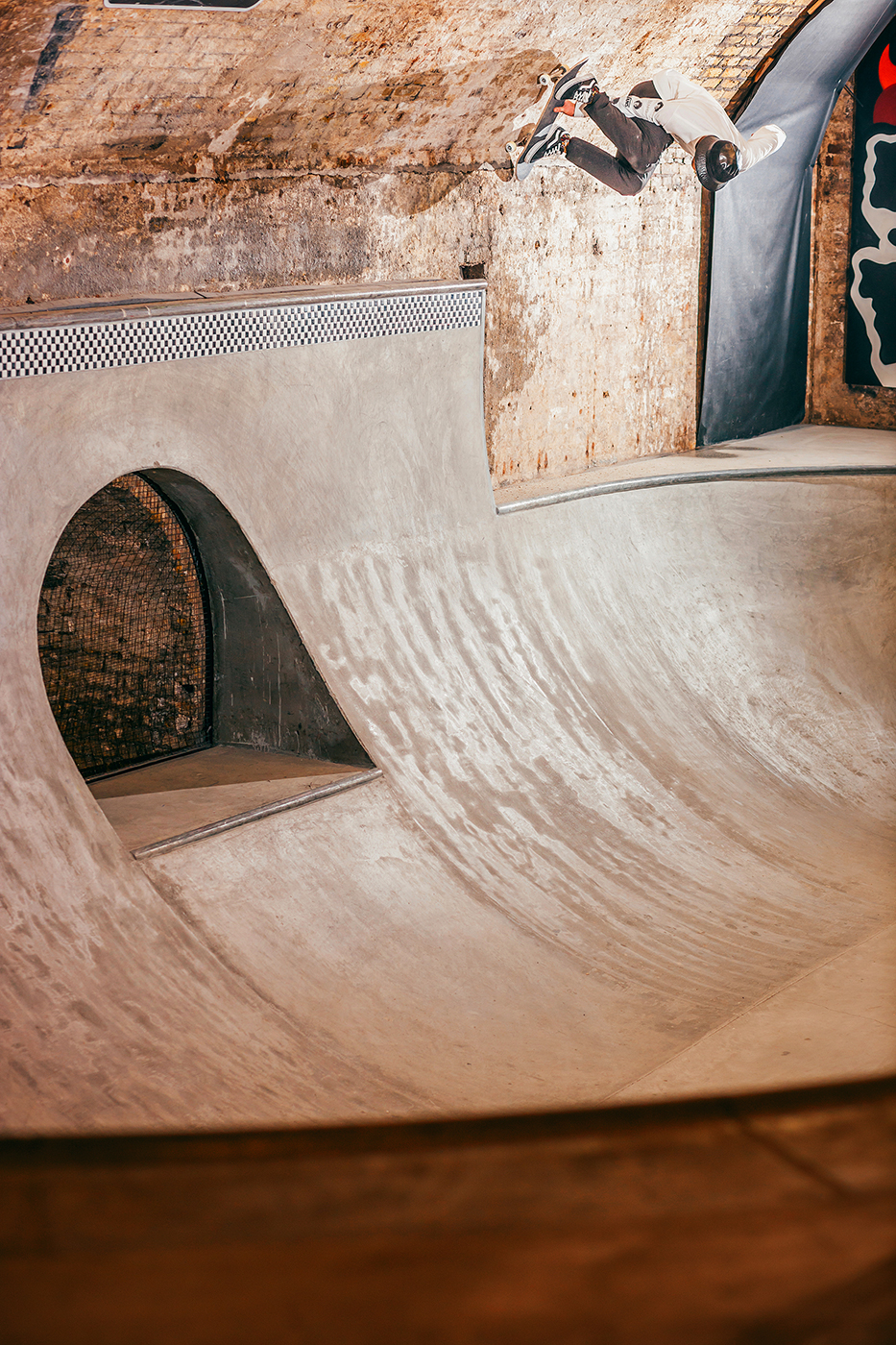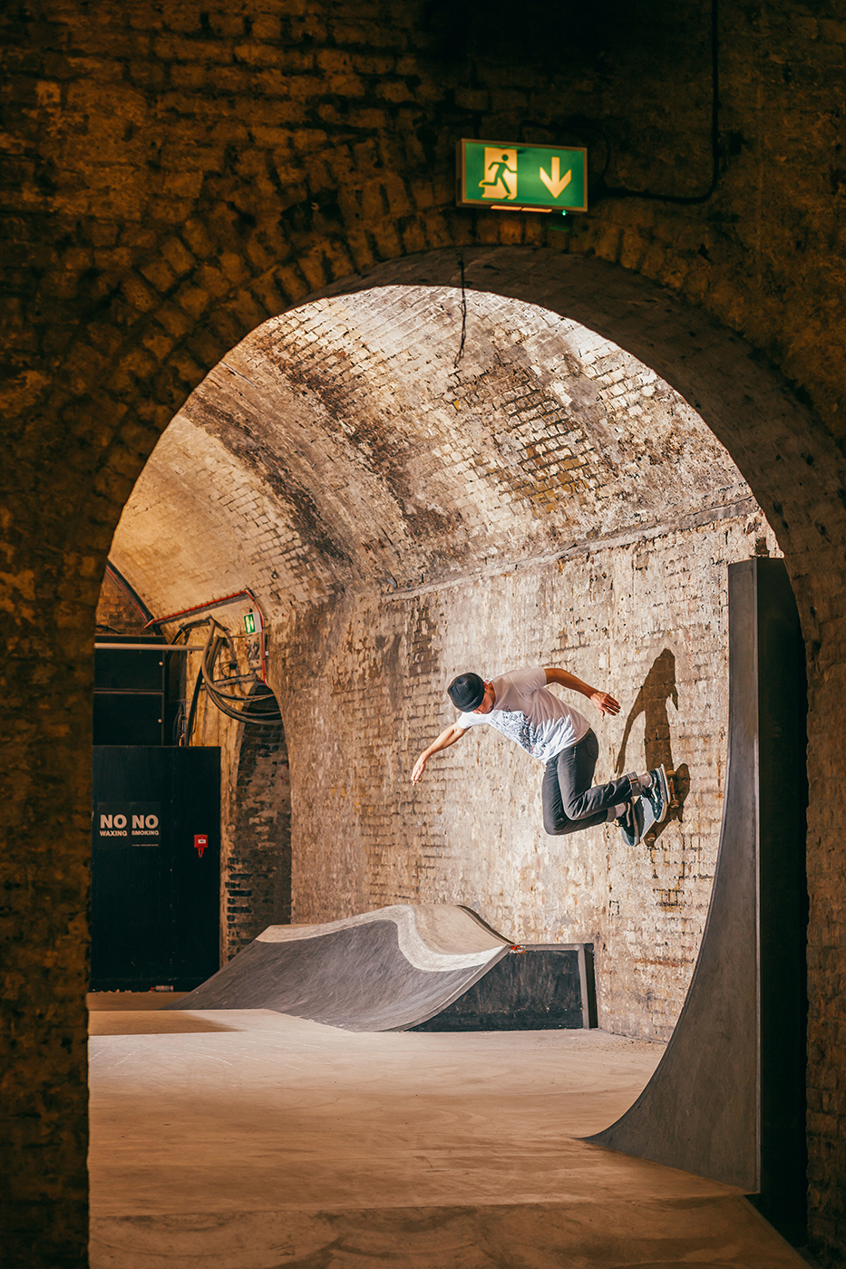 With a torrential rain storm unleashing itself upon London the moment we stepped off the train, Nick Roberts allowed enough time for his sodden shoes to dry off before engaging his knee support and kick starting the session. He teetered on the edge of this whippy tranny much to the delight of my camera lens.