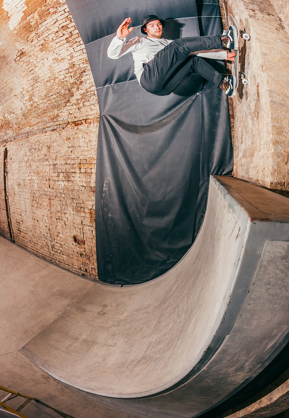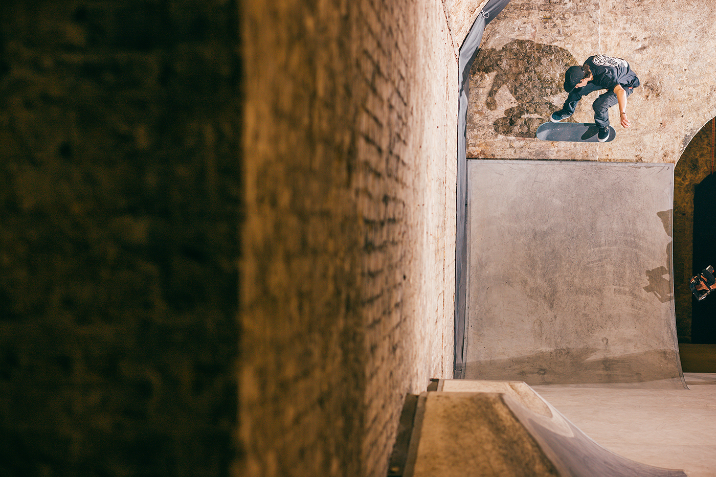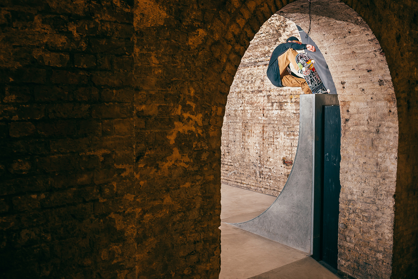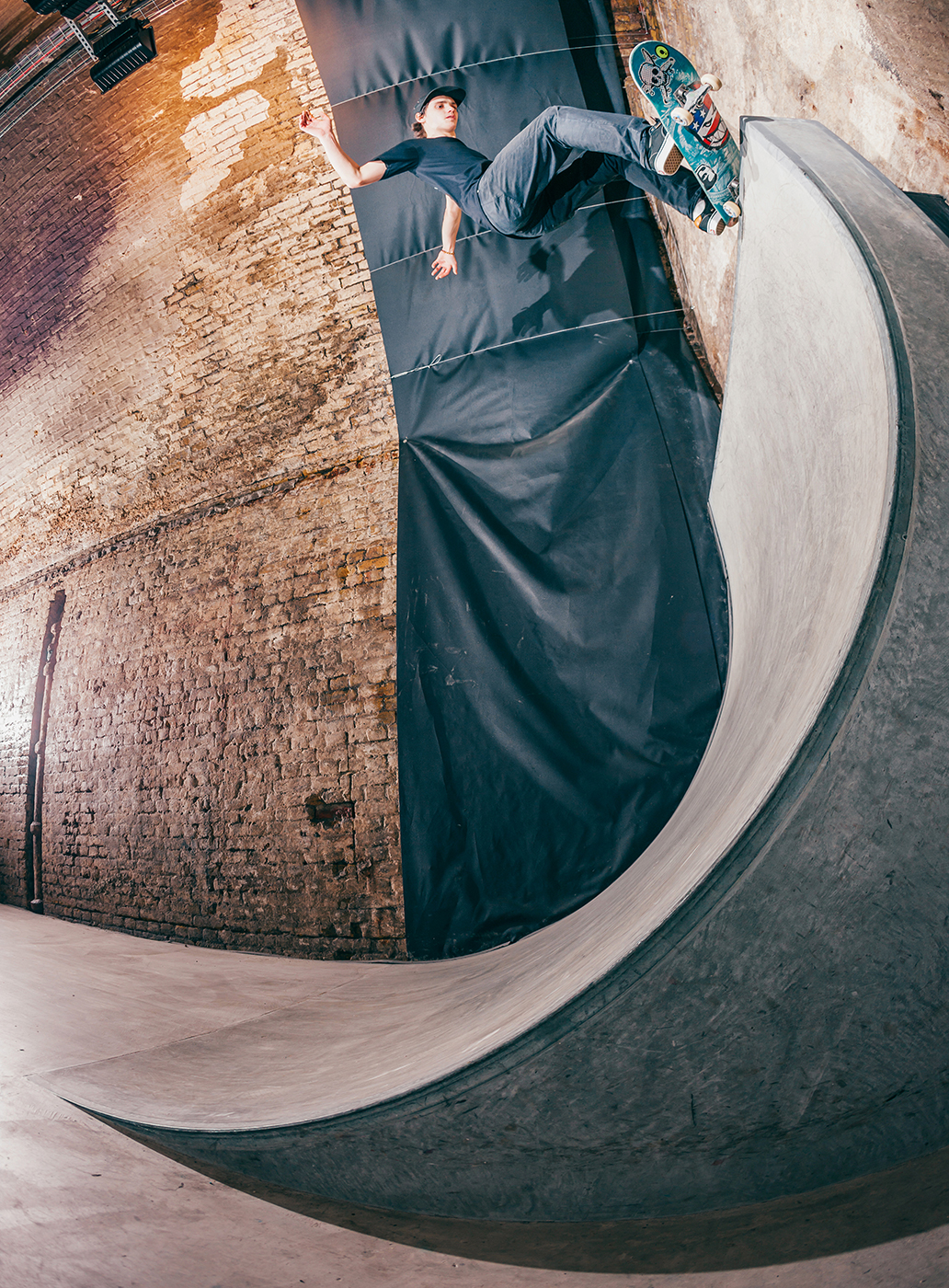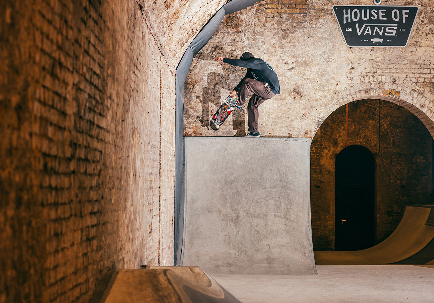 With a torrential rain storm unleashing itself upon London the moment we stepped off the train, Nick Roberts allowed enough time for his sodden shoes to dry off before engaging his knee support and kick starting the session. He teetered on the edge of this whippy tranny much to the delight of my camera lens.