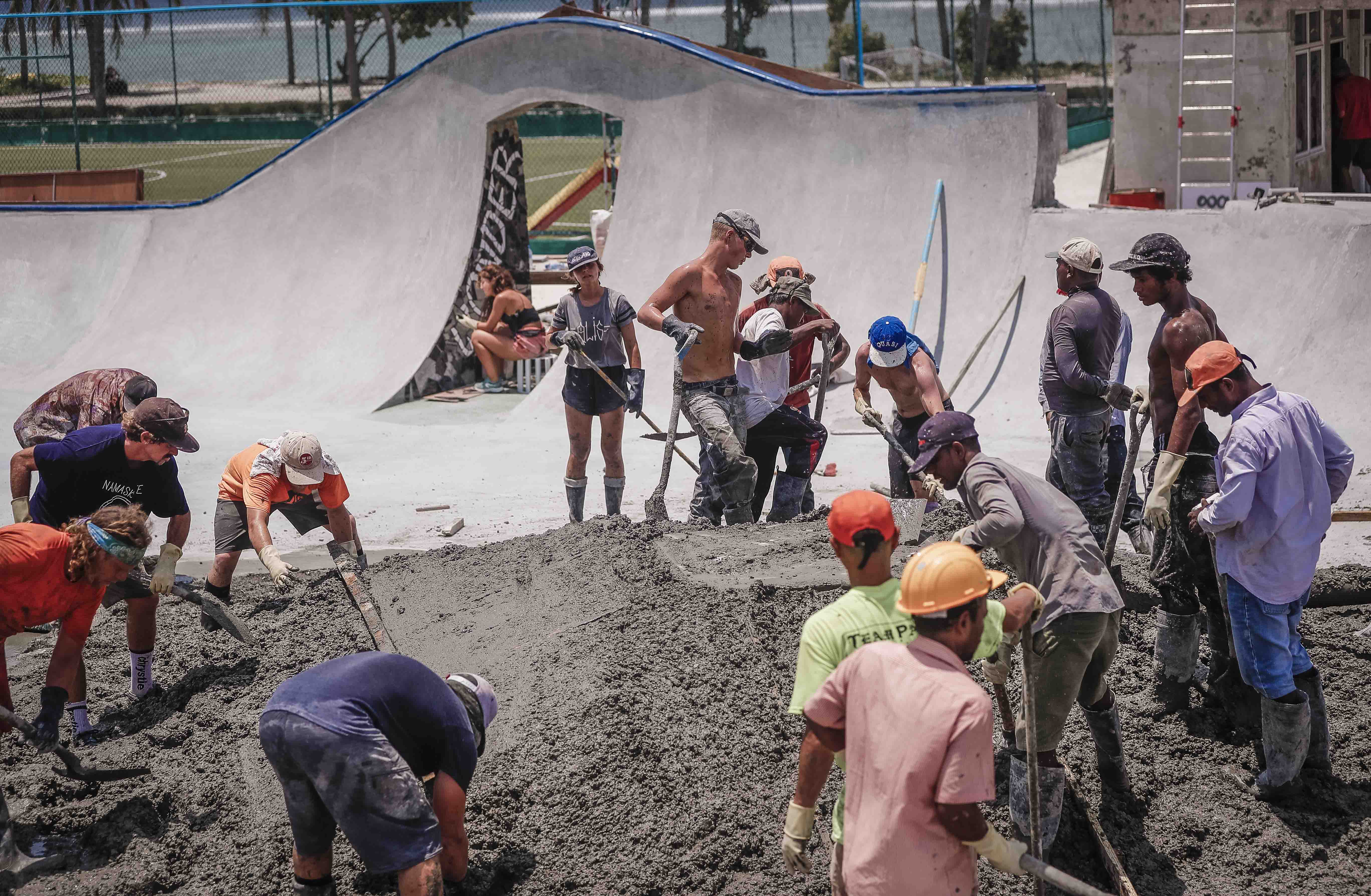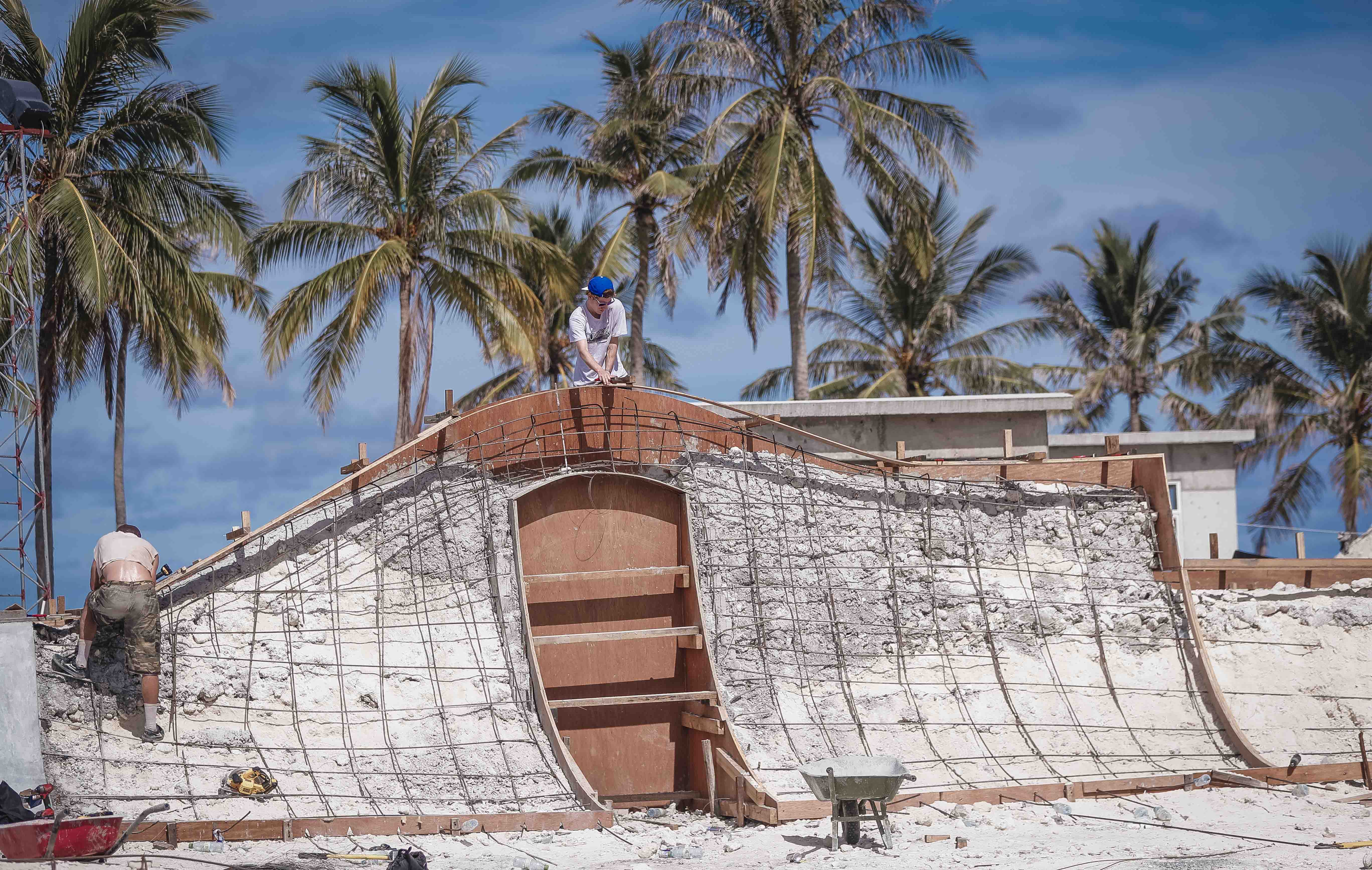 Luckily, Cornish nomad Rob Jones was involved in the build and, when I hit him up, it turned out he was working on the park and sharing living quarters with Justin ‘Pasty’ Ashby. A couple of Facebook messages later and I had a sketchy idea of how the two UK members of the 40-odd crew of concrete craftsman had been enjoying living island life, alongside a bevy of build photos courtesy of Mohamed Ahsan. I say sketchy, because my questions definitely weren’t answered straight after a morning coffee. I’ve no idea what adult beverage is de rigeur in the Maldives, but I’ve reigned in my normally compulsive grammar fixing in order to give you a better sense of where this interview is coming from – which is a fair way into consumption of whatever that drink might be…
