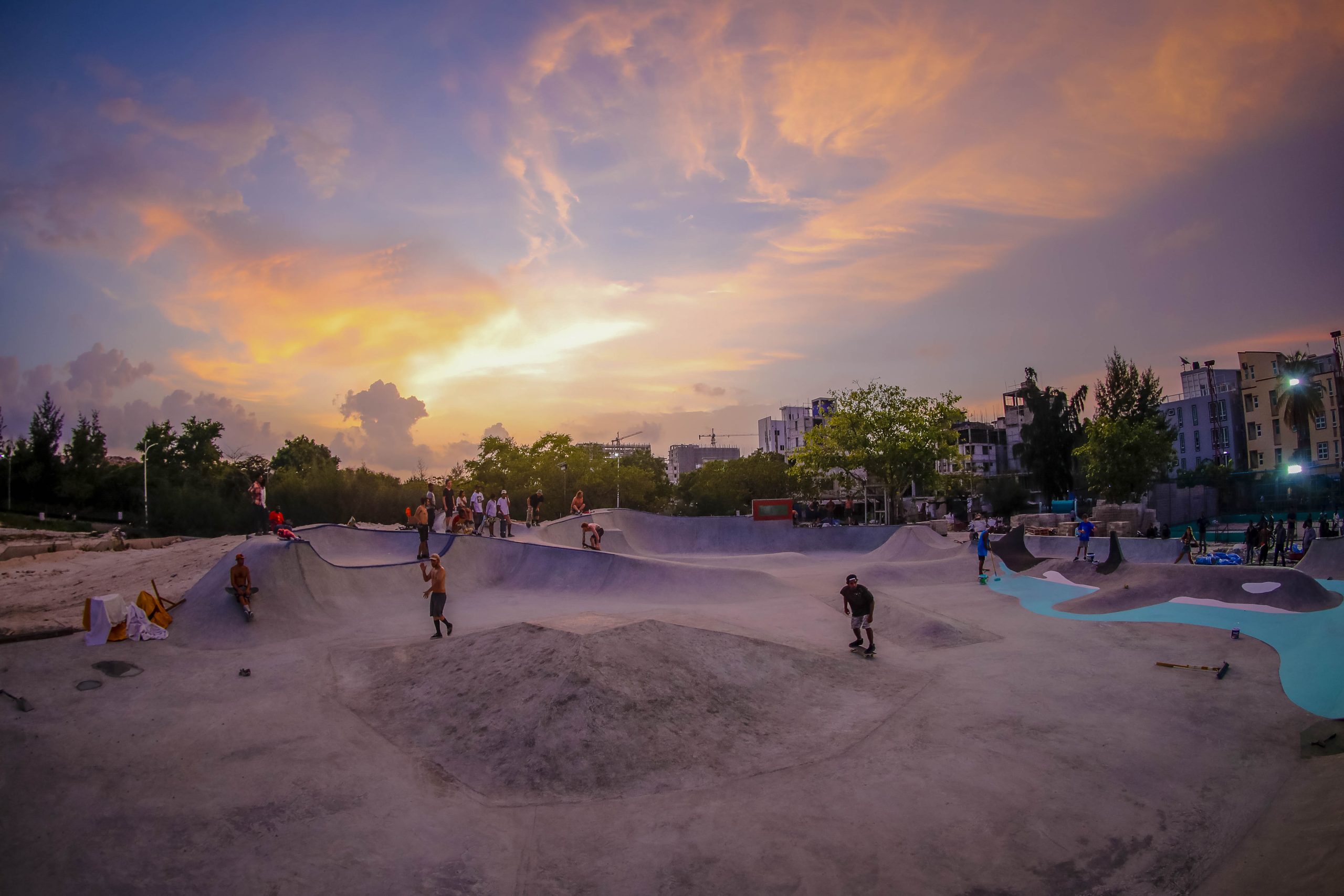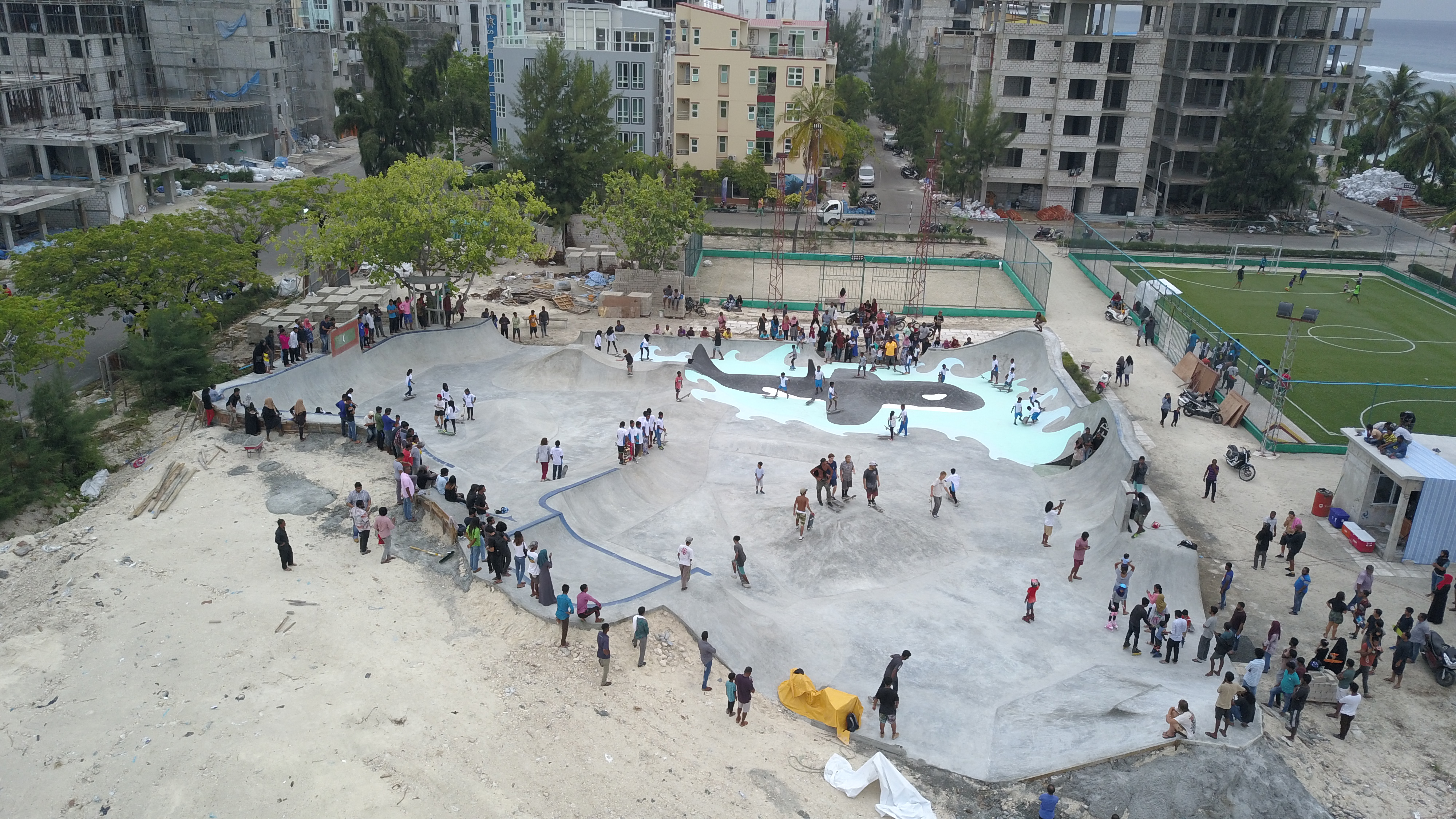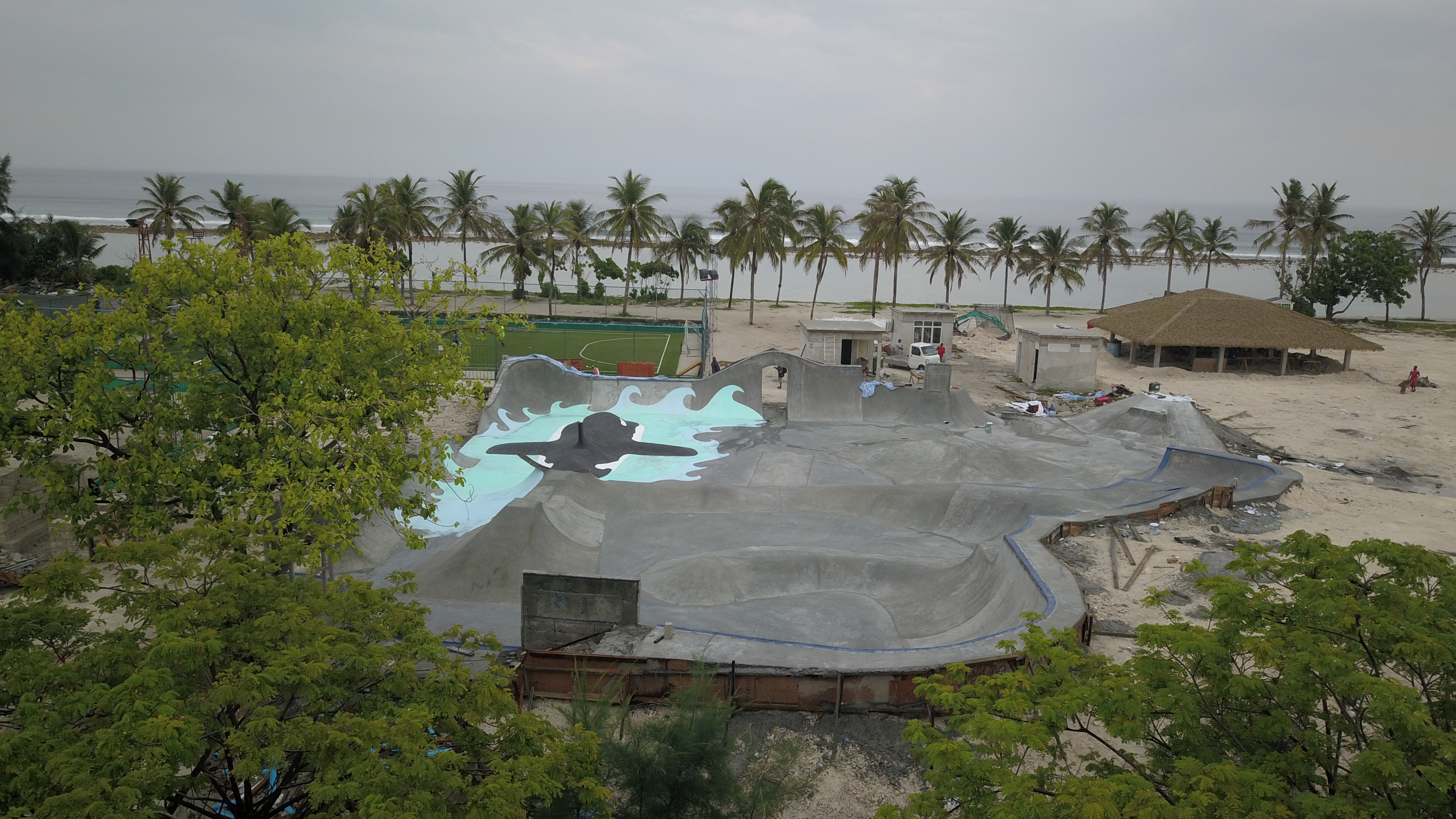 A couple of week’s ago, I started spotting a few images on social media of a large scale DIY build in a tropical looking location with what appeared to be a large, skateable killer whale as a centrepiece. Doing some digging via Confusion’s website soon had the location narrowed down to The Maldives, with Hulumale Skatepark being worked on by a large crew of international volunteers who all had an input into the final design. When the build edit appeared it was too much of an intriguing project to garnish with only my sketchy knowledge, gleaned from an office in London at a distance of, according to a quick Google search, 5,288 miles away.
