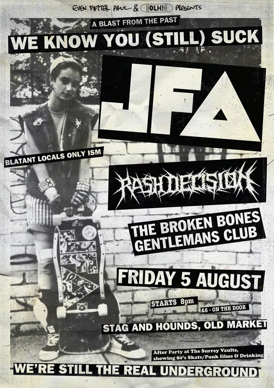 We will add more details as they surface, but for now check out the event page for their London gig with The Weirdos, Reagan Youth and Naked Agression, the Dean Lane event poster below, eye up the boards salaciously if you’re a collector and check out Phil Shao’s JFA-scored section as well as singer Brian Bannon’s section in the classic Santa Cruz skate flick Speed Freaks…