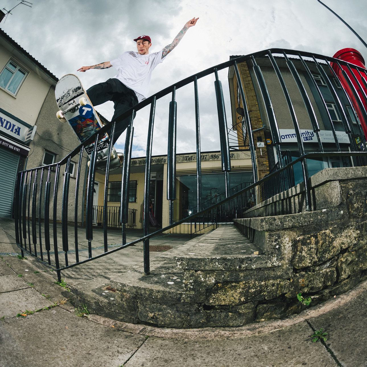 It was around 2013 when I was at Route One but I was kind of only getting the boards because I worked there. I had filmed some footage with James Harris and bits that were in local scene videos. Not long after that I met George Nevin, which is how I got a trick in his scene video ‘Bristol’s Finest’. Around this time Danny (Wainwright) asked me to ride for Fifty Fifty and Rich Smith spoke to me about getting on Skateboard Café.