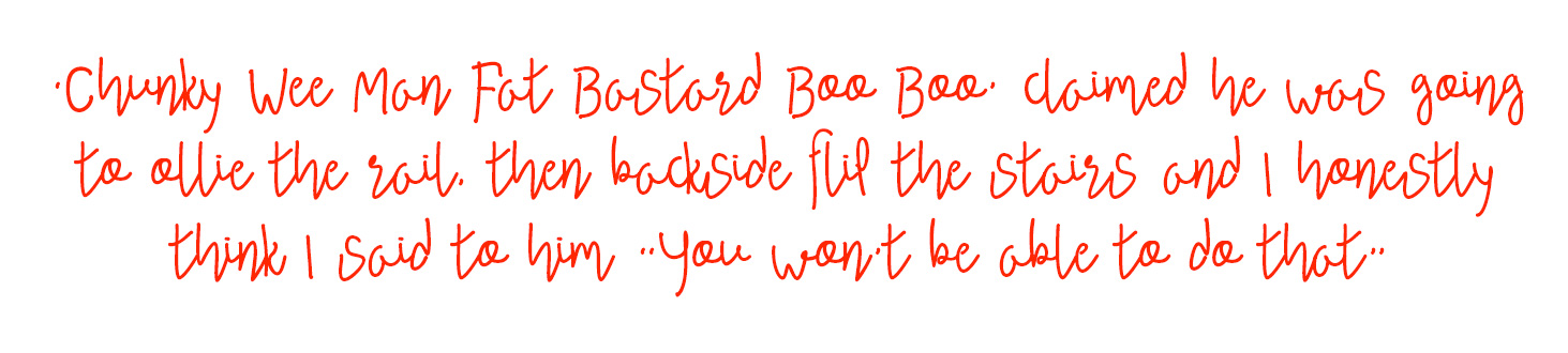First up is the clip of Dale at the Casino rail spot that Lintell shut down a few years back. ‘Chunky Wee Man Fat Bastard Boo Boo’ claimed he was going to ollie the rail, then backside flip the stairs and I honestly think I said to him “You won’t be able to do that”. I didn’t think he had the fast feet for that sort of shit. Sure enough, he made it within a few tries and I love the way he rolls away from that backside flip. I was really hyped on that!