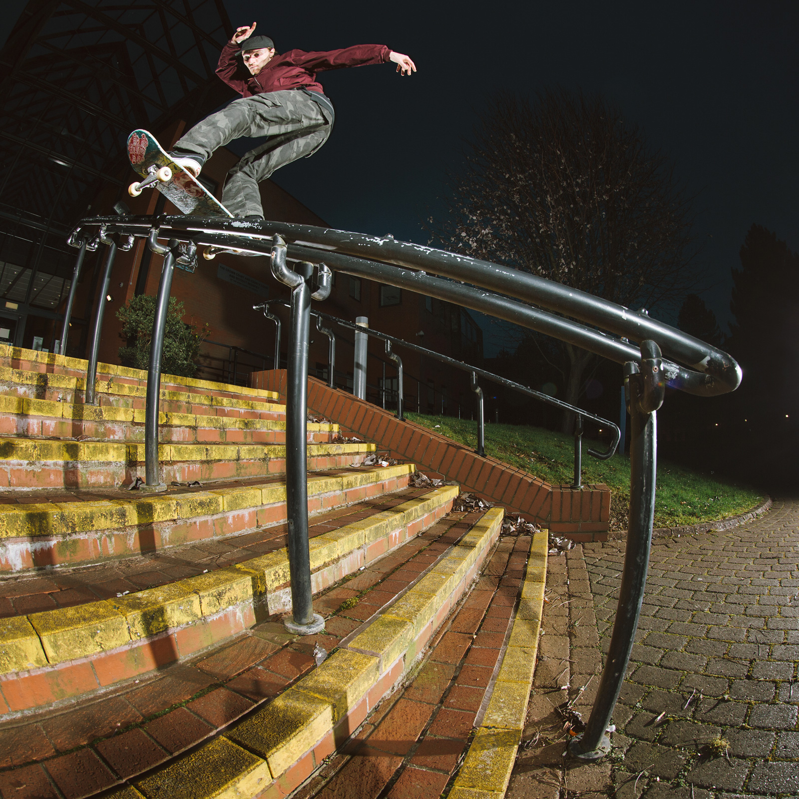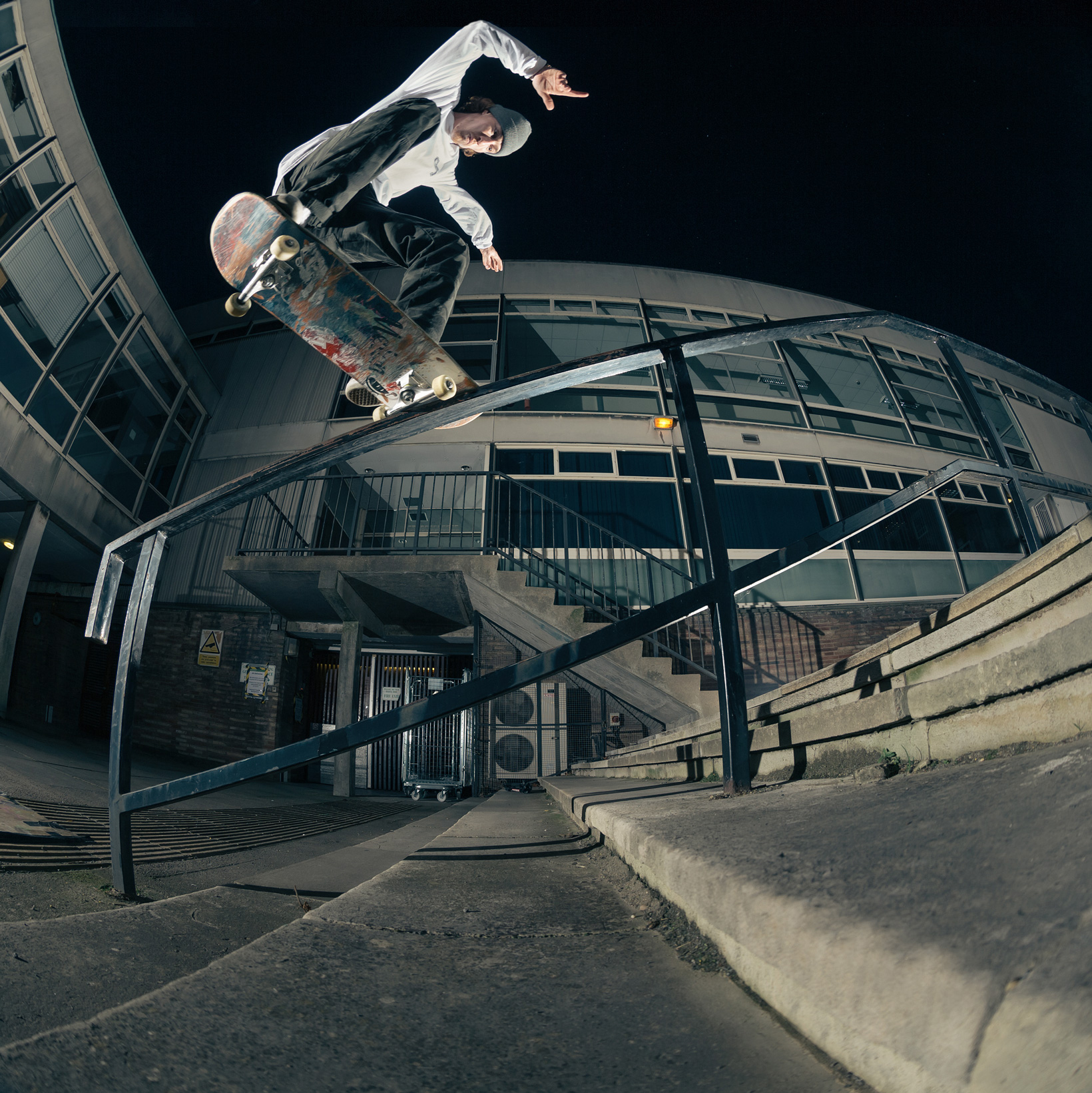 Backside 180 fakie nosegrind on the tall Nottingham County Hall rail. Photo CJ