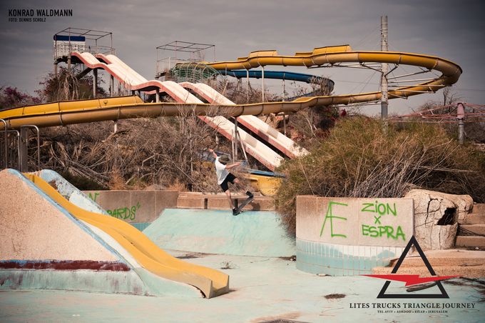 Israel seems to be the destination du jour in skateboarding at the moment, with tour videos coming in from all sides. It is easy to see why when you see some of the spots they have tucked away, unexpected banks and street transitions in the kind of settings that are a cinematographer’s dream! Lites Trucks are the latest visitors, hitting Tel Aviv, Ashdod, Eilat and Jerusalem to find any spot they can uncover included an incredible looking abandoned water park. This is the trailer for ‘Triangle Journey’, with Justin Sommer, Konrad Waldmann, Giorgi Balkhamshvili, Marco Kada, Martin Huppertz, Marlon Schollmeier, Max Ritter, and Dennis Scholz.