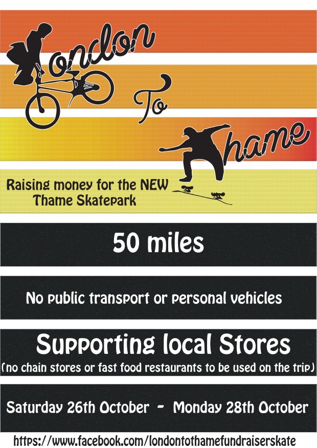 Over October 26th-28th, a group of skateboarders and BMX riders will be making a 50 mile charity skate/ride from London to Thame in hope of raising money for the regeneration of Thame Skatepark.