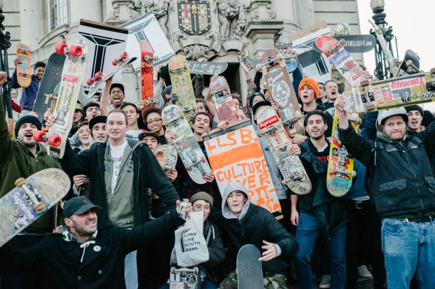 Yesterday afternoon, the Long Live Southbank volunteers, supporters and an army of Undercroft regulars skated from Southbank to the Town Hall to hand deliver Lambeth Council a further 26,000 signatures opposing the redevelopment of one of the worlds longest standing skate spots. Prior to the handing over the papers, locals dried the area out and put on a number of best trick style competitions whilst final signatures were gathered.