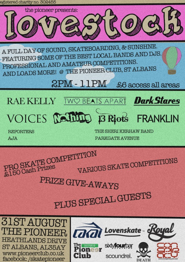 Pioneer Skatepark in St Albans are bringing you music, skateboarding and more on August 31st – check the Lovestock Festival poster for the details…