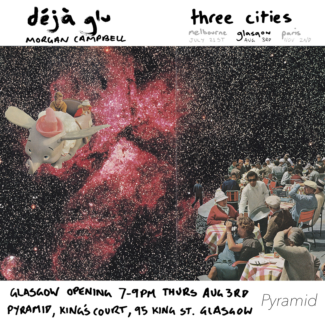 Nomadic Antipodean Morgan Campbell will be opening his ‘Three Cities’ exhibition in Glasgow tonight (03/08/17) at Pyramid in Kings Court. Head down from 7pm tonight to see what collage work he’s been doing under the déjà glu moniker and scroll past the flyer to read the blurb for more info on what it’s all about!