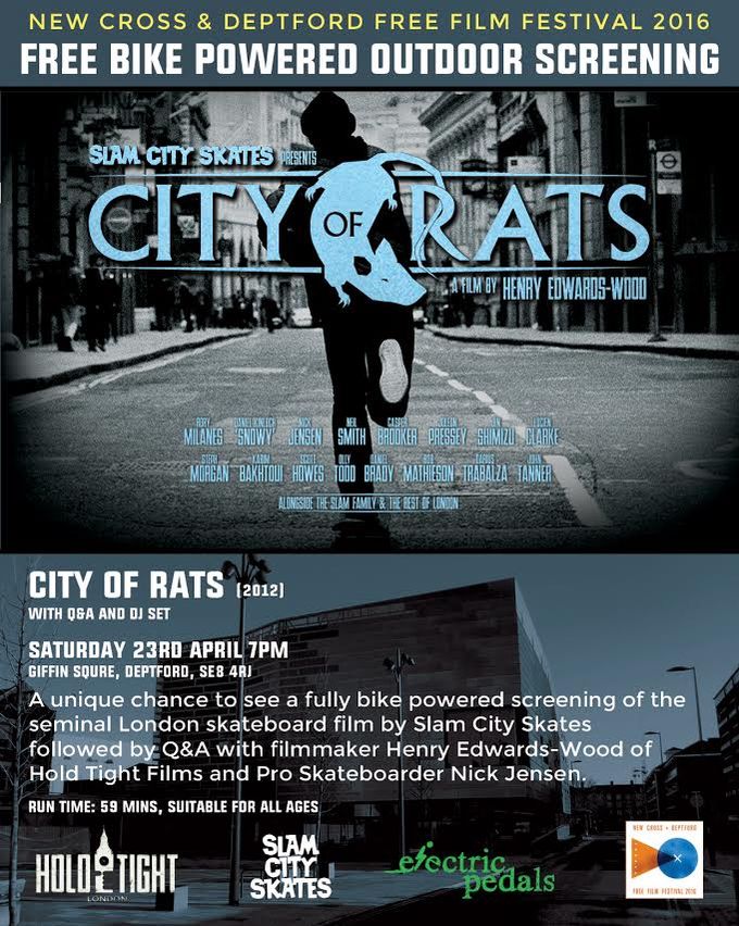 The New Cross and Deptford Free Film Festival will include this year a free outdoor screening of Slam City Skates and Henry Edwards-Wood’s seminal London production City of Rats. Held in Giffin Square this coming Saturday (23/04/16) at 7pm, and with the screening powered by bikes, this seems like a solid skate wind down plan alongside a few beers and followed by a grimly satisfying Wetherspoons dinner in Peckham – if there’s a better plan for a Saturday night in South London, I haven’t heard it! Click the flyer for more details…