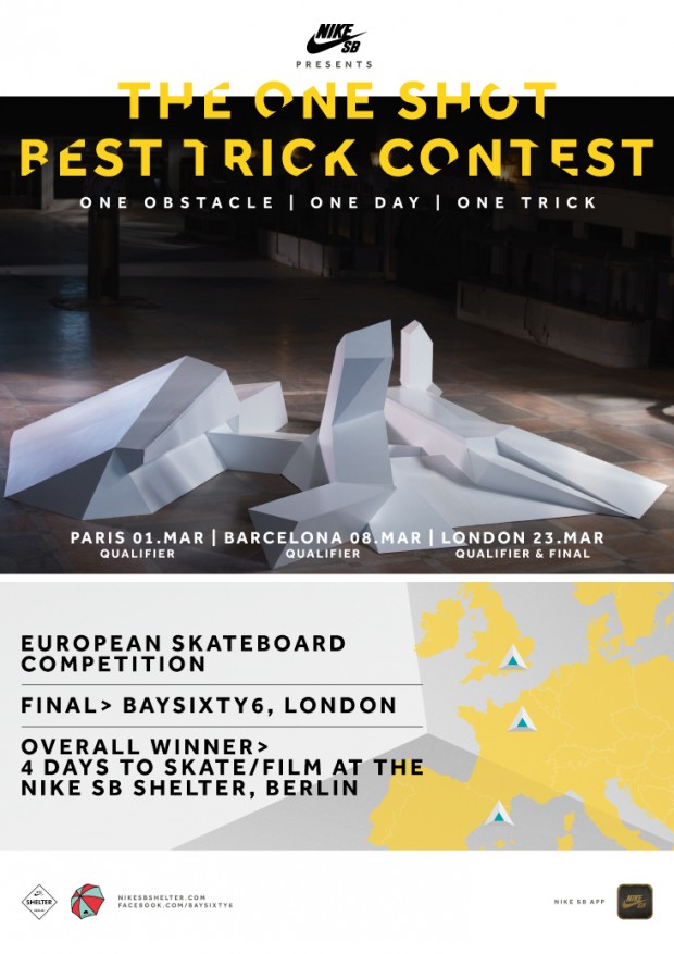 The final will be at the BaySixty6 Skatepark in London where all qualified riders will be invited to battle for the grand prize: a four day trip for the winner plus a friend to the freshly opened Nike SB Shelter in Berlin.