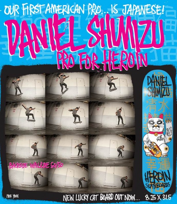 This one’s been circulating around the internet rumour mill for a while now and comes roughly a month after the release of his pro deck, but it was finally confirmed yesterday that Nike SB’s Daniel Shimizu is the first US pro on Fos’ reshuffled Heroin Skateboards!