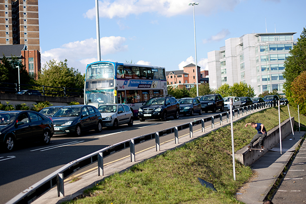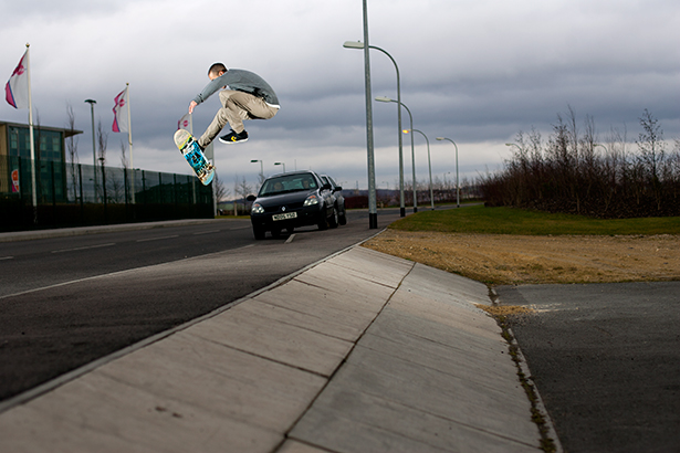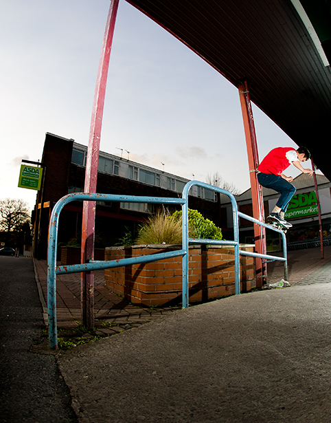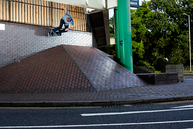 During a one-off sunny weekday in the early spring, Lee Rozee, Vince Orr and myself met up and decided to go for a dedicated spot search around Leeds in a quest for something new. We ended up trekking through the sketchy back streets of Hyde, climbing into abandoned schools and eyeing up potential spots where you would get your head kicked in if you attempted to skate it. We continued into Burley Park but again couldn’t find anything. The fun part about it was the cruising around between unskateable spots. We eventually found this grim ledge near the city centre, which we’d never seen so we thought we’d skate it instead of hitting up the same old spots in town.