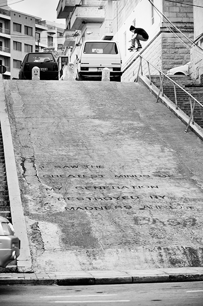 This was a beacon of light on a pretty hellish trip to Malta. Josh had already fucked his ankle by this point and we’d had more than our fair share of non-existent spots and shitty weather. We’d passed this a few times in the van and we weren’t really sure if was doable, I was really surprised when Josh just started jumping over it straight away, especially considering the crappy run up at the top. I was stoked on those pillars with the faces, the white wall behind him and the writing on the hill: “I saw the greatest minds of my generation destroyed by madness”.