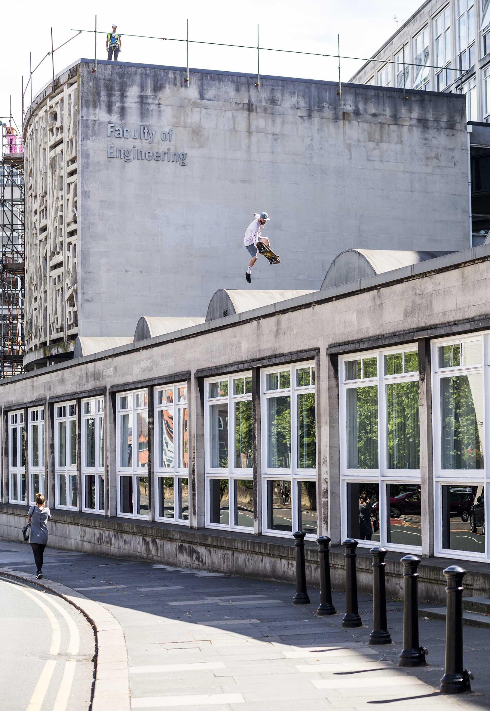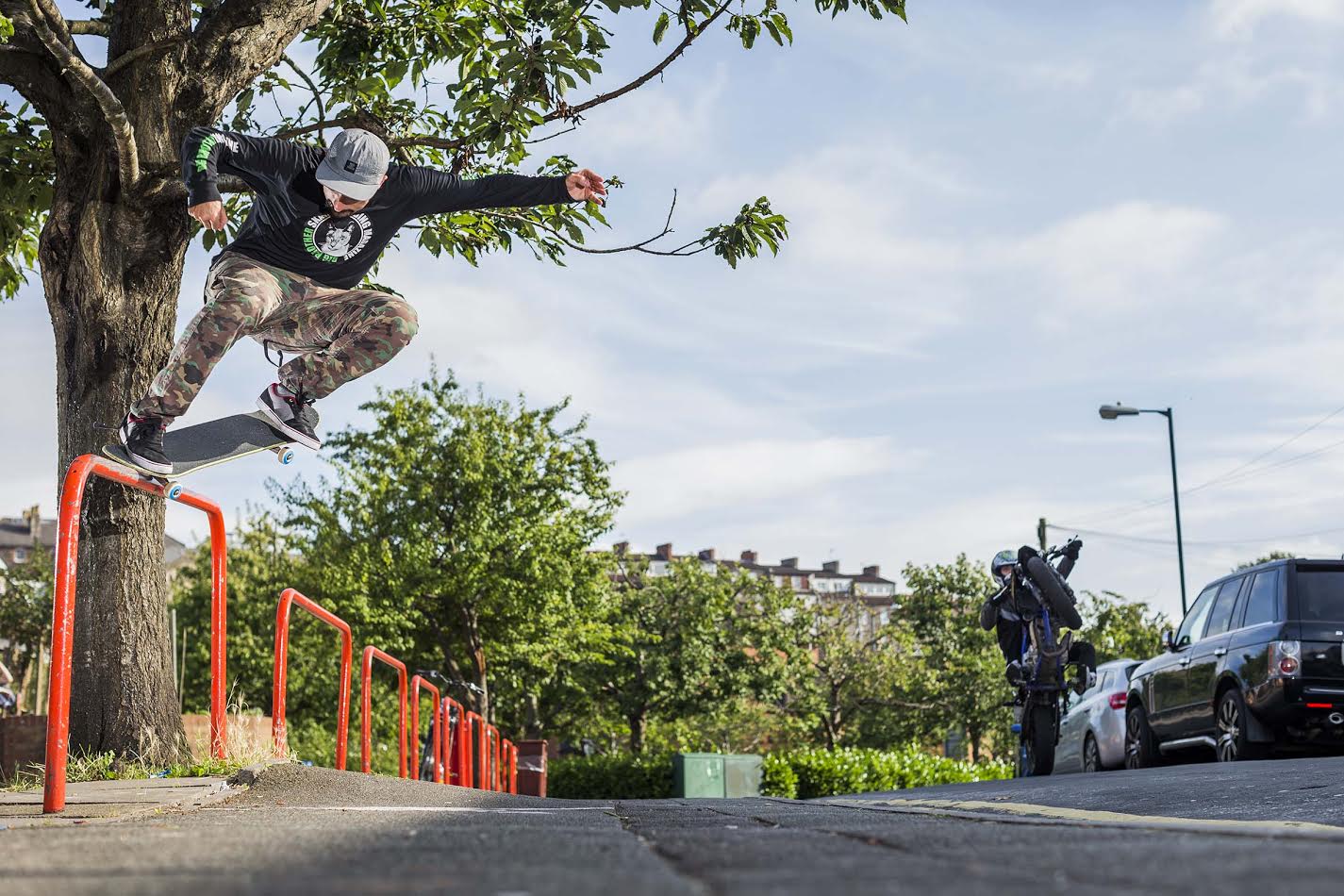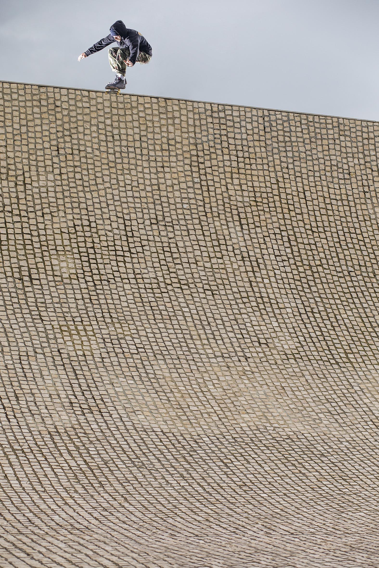 A couple of hours later we returned and everyone got a proper skate on, Denis felt lonely in the van and wanted to be the centre of attention so he decided to drop into the huge cobbled ‘tranny’. One thing led to another and he just decided was keen to do a roll in without warning anyone. His wheels couldn’t take it so he grabbed Sirus’ filmer board with bigger wheels. He continued to eye up the spot while looking like a battered Rocky Balboa, he could barely open his right eye. I got set up just in time before he decided to change his mind. After a lot of anticipation he went for it and was so close to skidding out at the bottom but managed to hold on and pull it off, this was one of the most ridiculous things I’ve witnessed for sure. After this he was once again the centre of attention and the world was normal again.