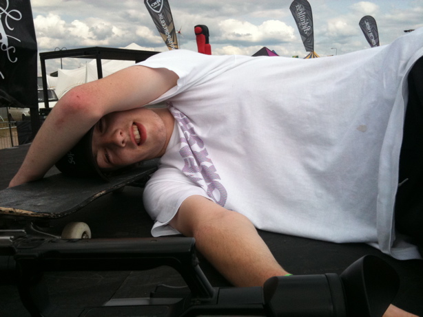 Here you can see Nev suffering following a brief scrap with a picnic table and a bin.