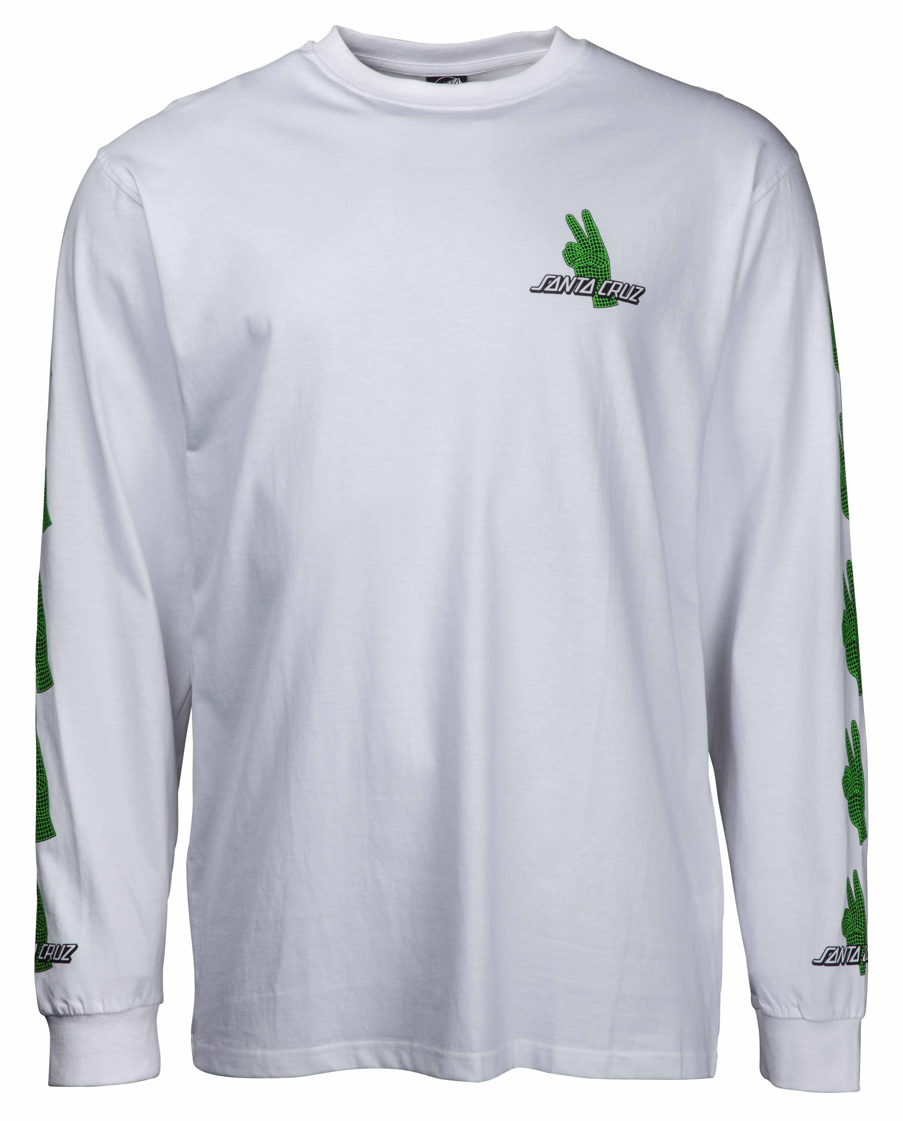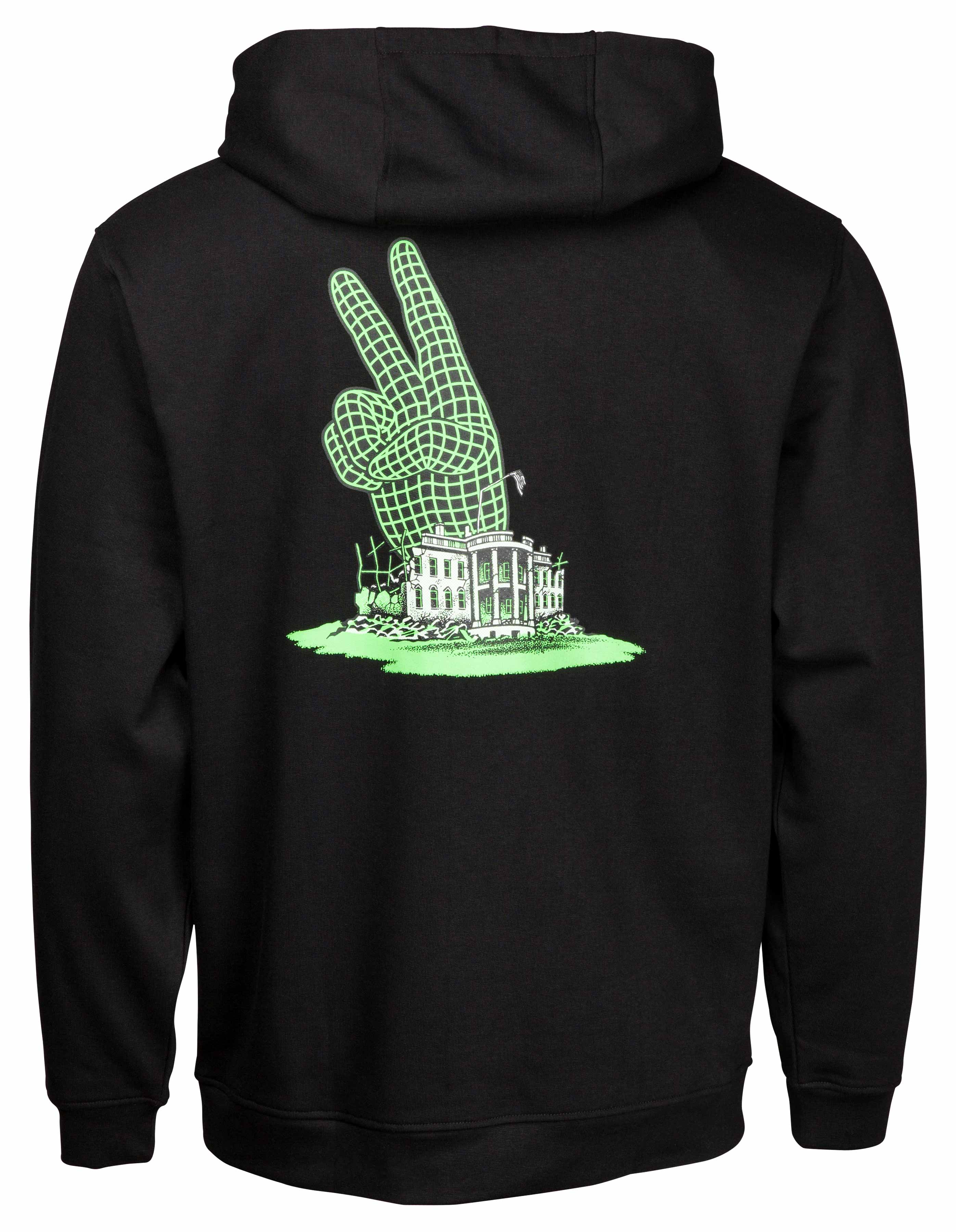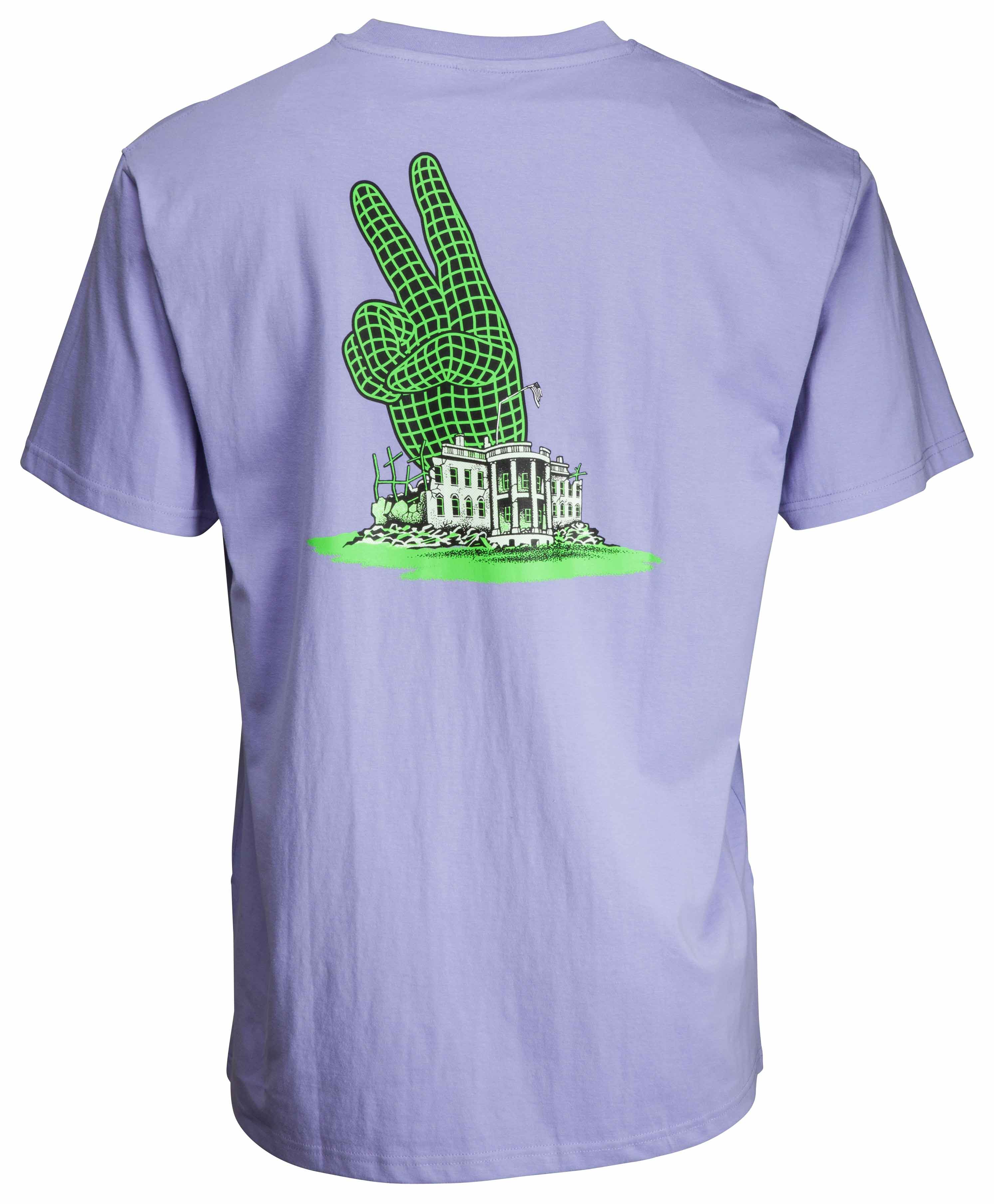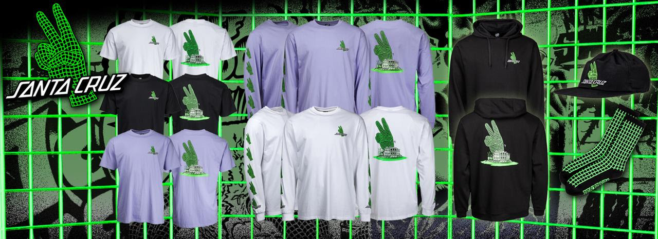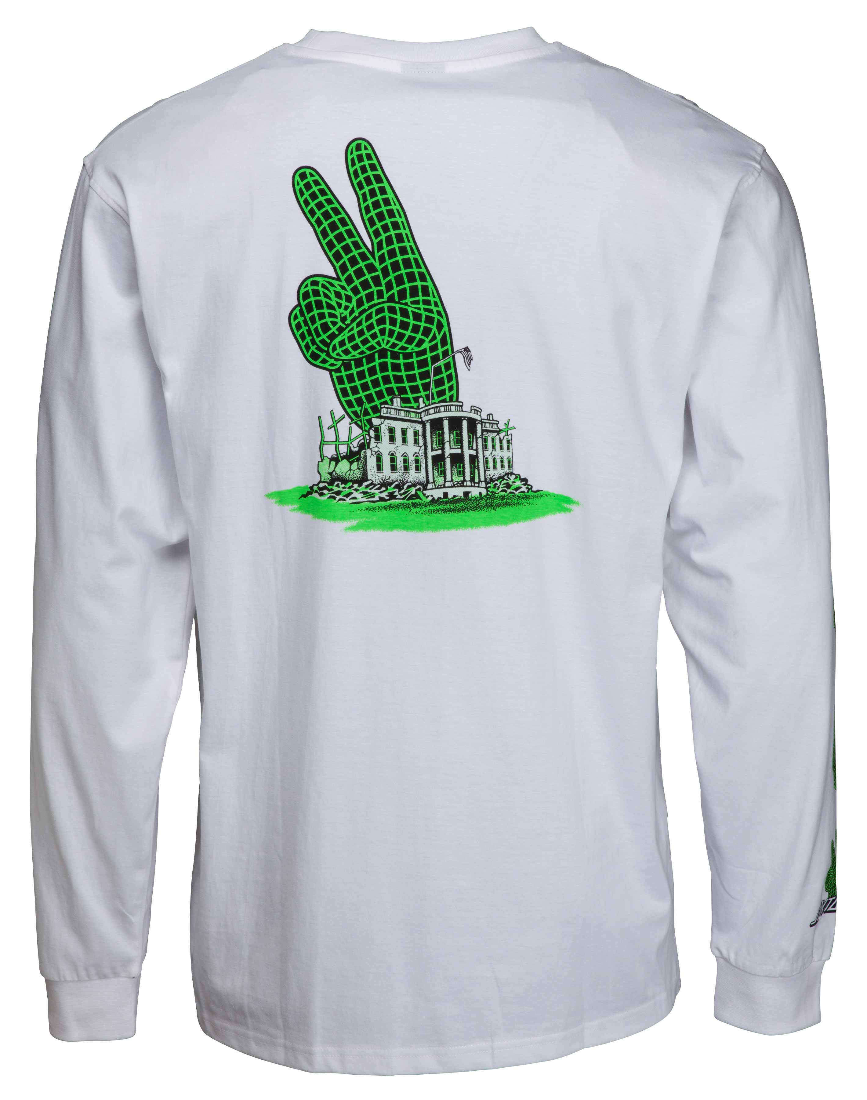 In an alternatively-themed offering for the Holiday season, Santa Cruz have just released a new limited edition clothing capsule featuring a homage to Jim Phillips‘ original graphic for OG Santa Cruz Skateboards pro Jeff Kendall. Originally inspired by the omnipresent threat of all-out global nuclear conflict that hung like a cloud over 80’s America, Phillips original artwork references an 80’s interpretation of Atomic Apocalypse with Tron-inspired colours and a partly demolished White House, complete with an ironic peace sign.