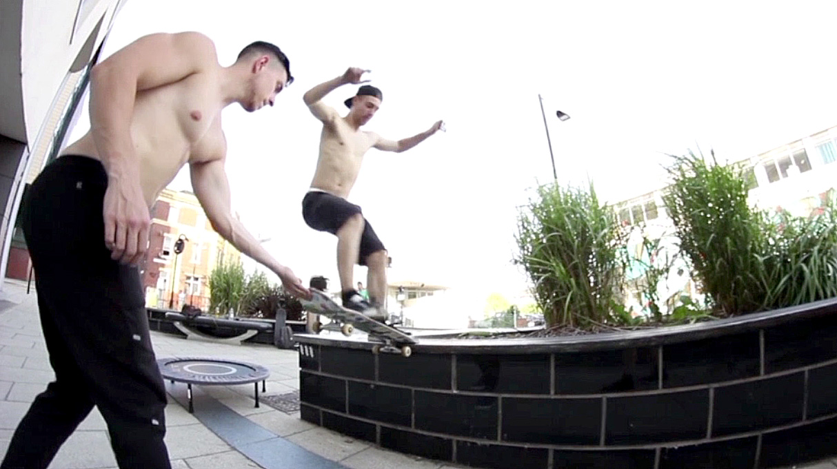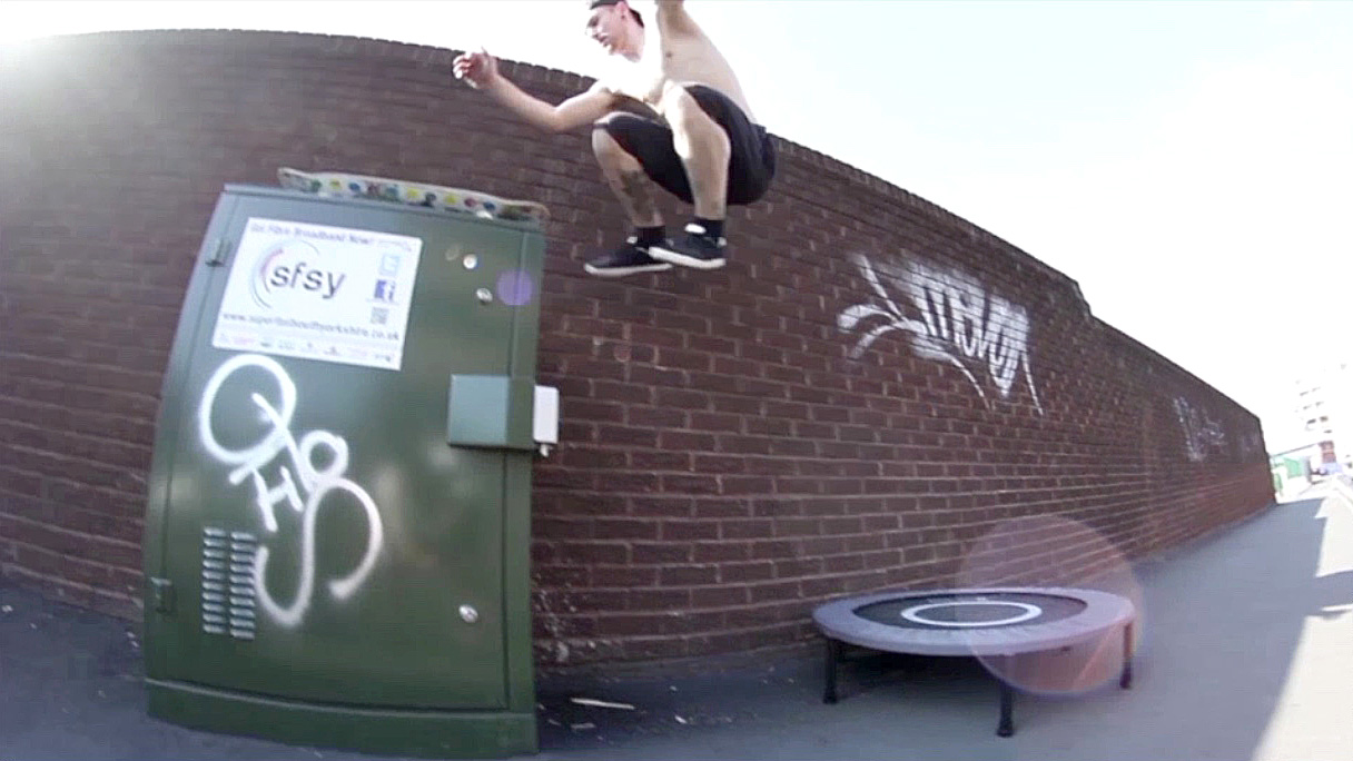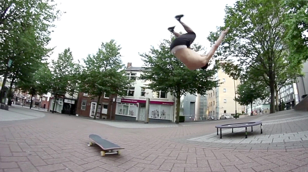 Basically, on the hottest day of the year we dragged a trampoline round the centre of Sheffield and made it up as we went along. I think the thing that surprised me the most was how kind the public were to us: we even drew a crowd filming a few of the tricks. That front flip from Ash Mercer was one of the last things we filmed – as it was finally cool enough to do it. By the time he got the make, we had a decent sized crowd cheering him on. I still have no idea how he got away with not breaking his board.