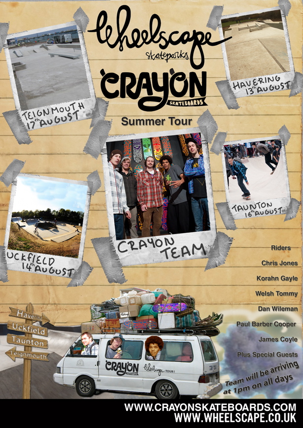 Dykie and the Crayon Skateboard boys, consisting of Chris Jones, Korahn Gayle, Dan Wileman, Paul ‘Barber’ Cooper, James Coyle, Welsh Tommy and special guests, will be embarking on a brief summer tour of Wheelscape Skateparks over August 13th-17th.