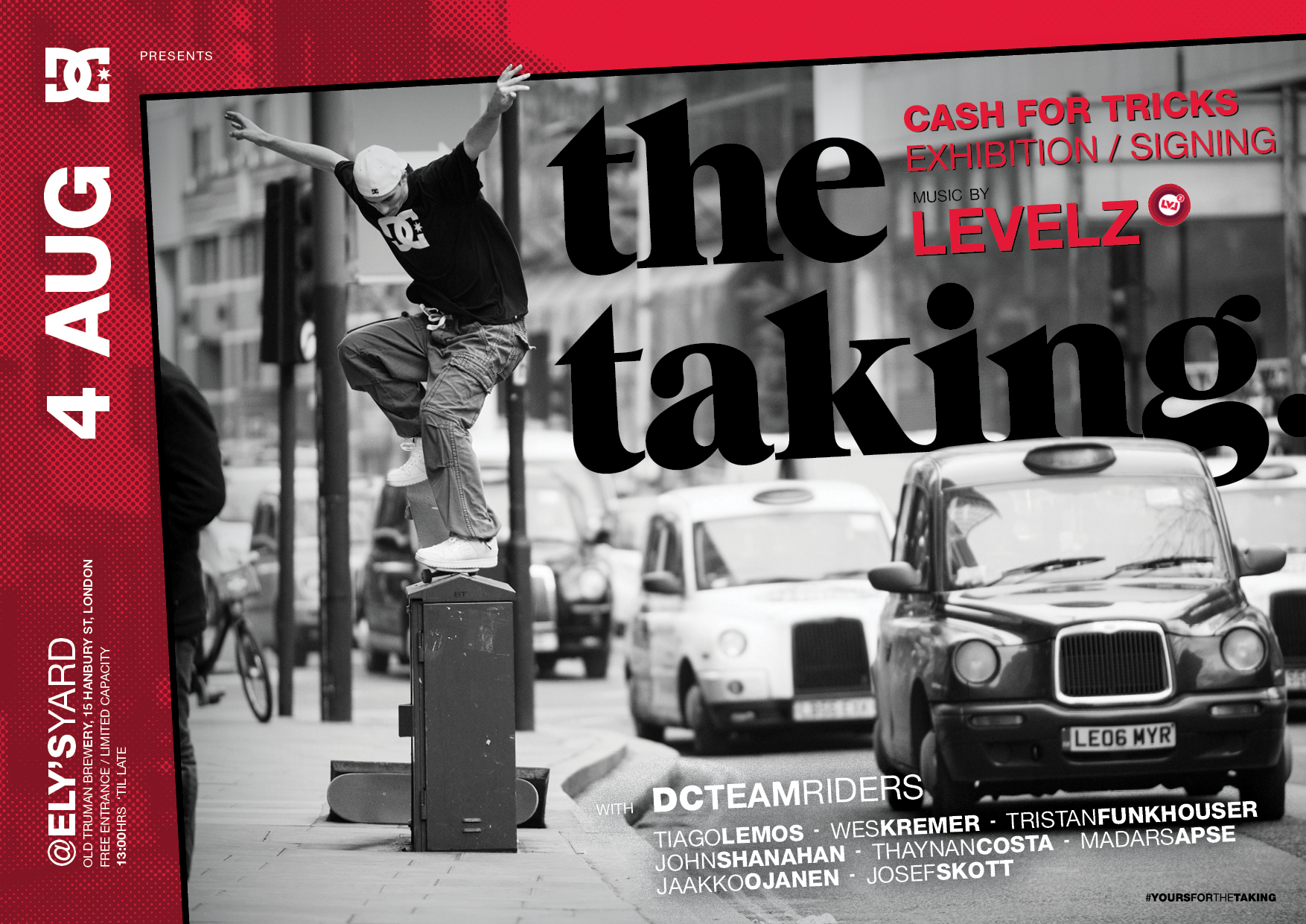 “DC’s awesome ten day UK skate tour will culminate on Saturday, 4th August with a full on invasion of the Old Truman Brewery for THE TAKING, London. In conjunction with the Yours for the Taking campaign, DC will be creating a one-off park setup focused around a massive black-cab-gap which will be open all day to local skaters, with demos from the pros and a classic skate jam plus Cash for Tricks comp. DC will also have a unique exhibition at Unit G4, Dray Walk which will explore the history of the brand’s skate and streetwear fashion heritage – back to the days of Droors Clothing and the OG Lynx.
