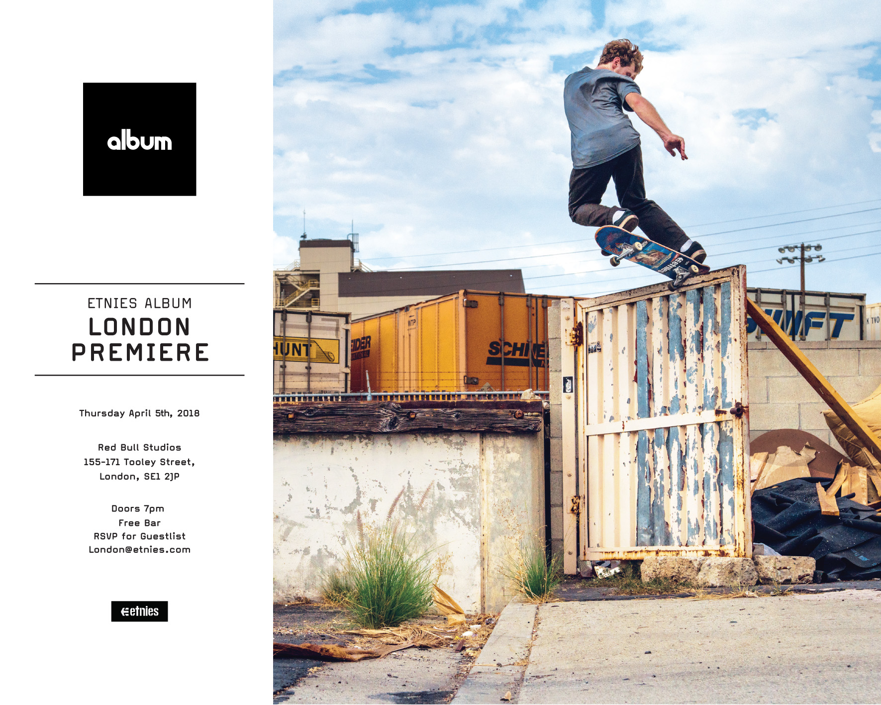 The London premiere for the latest Etnies video ‘Album’ is confirmed for April 5th and will be happening at Red Bull Studios, 155-171 Tooley Street, London.