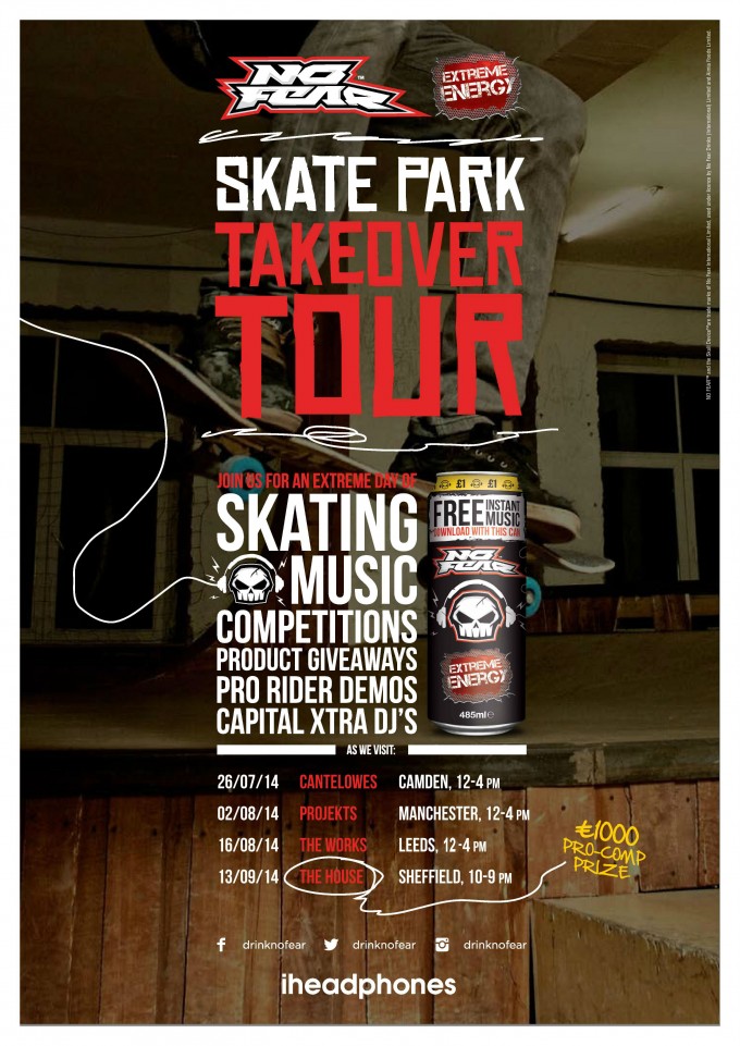To celebrate our new music download cans, No Fear Extreme Energy is taking summer 2014 by storm! We are going on tour and bringing tricks, tunes and energy to a skate park near you. The Skatepark takeovers will see top skate pros, djs and fans in London, Manchester, Leeds and Sheffield.