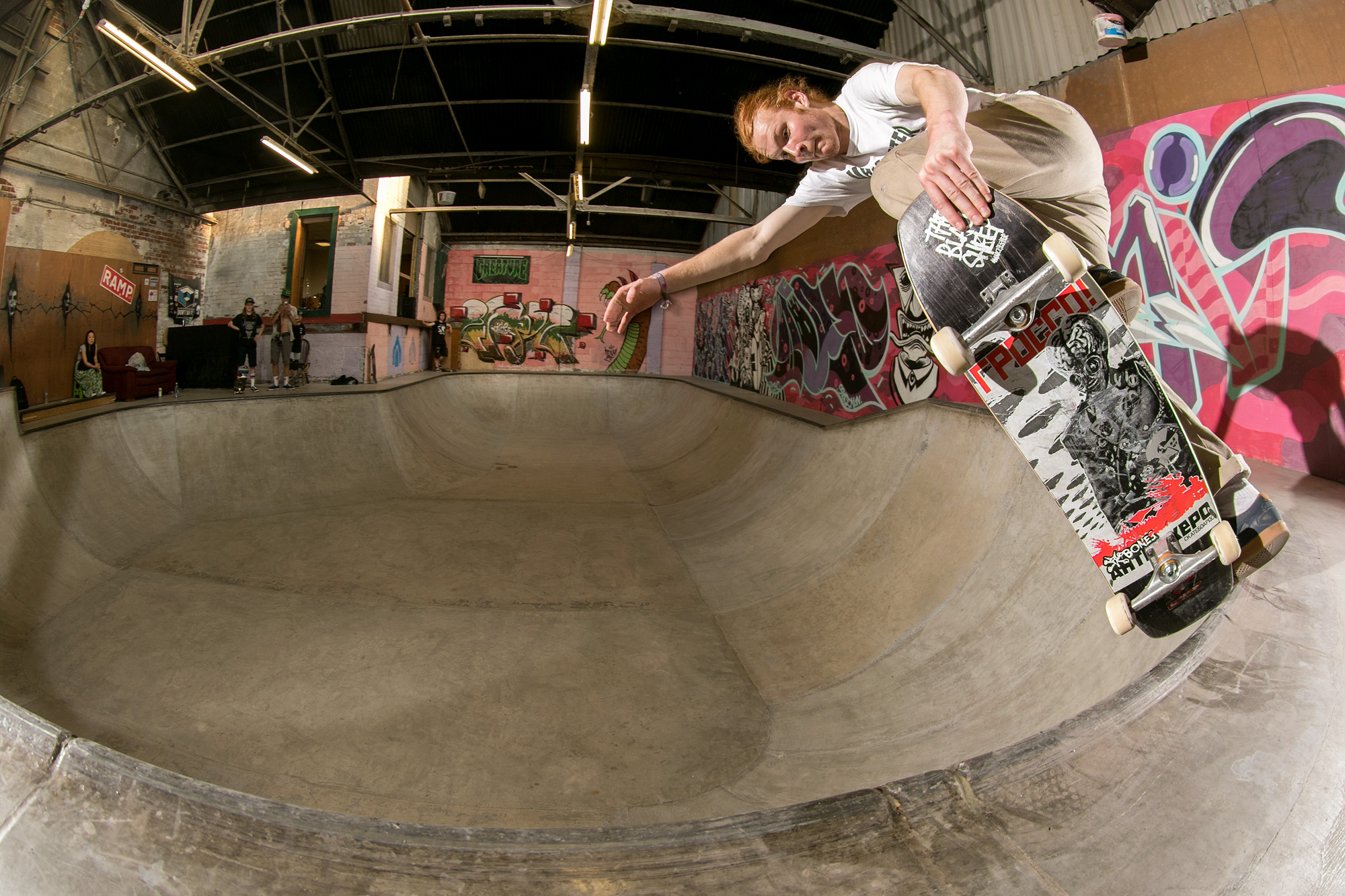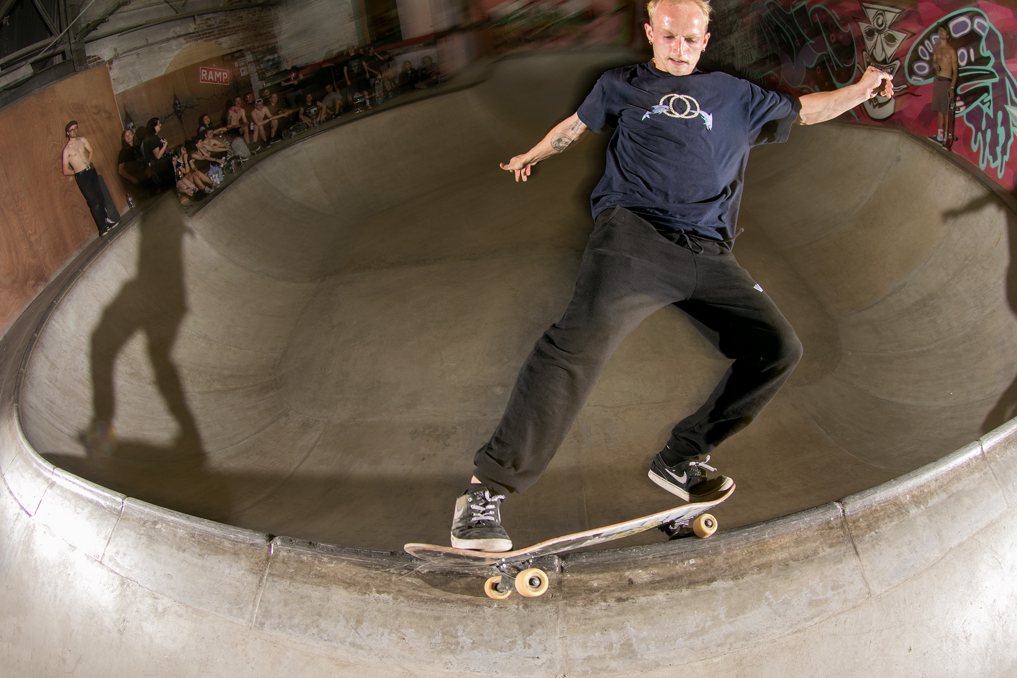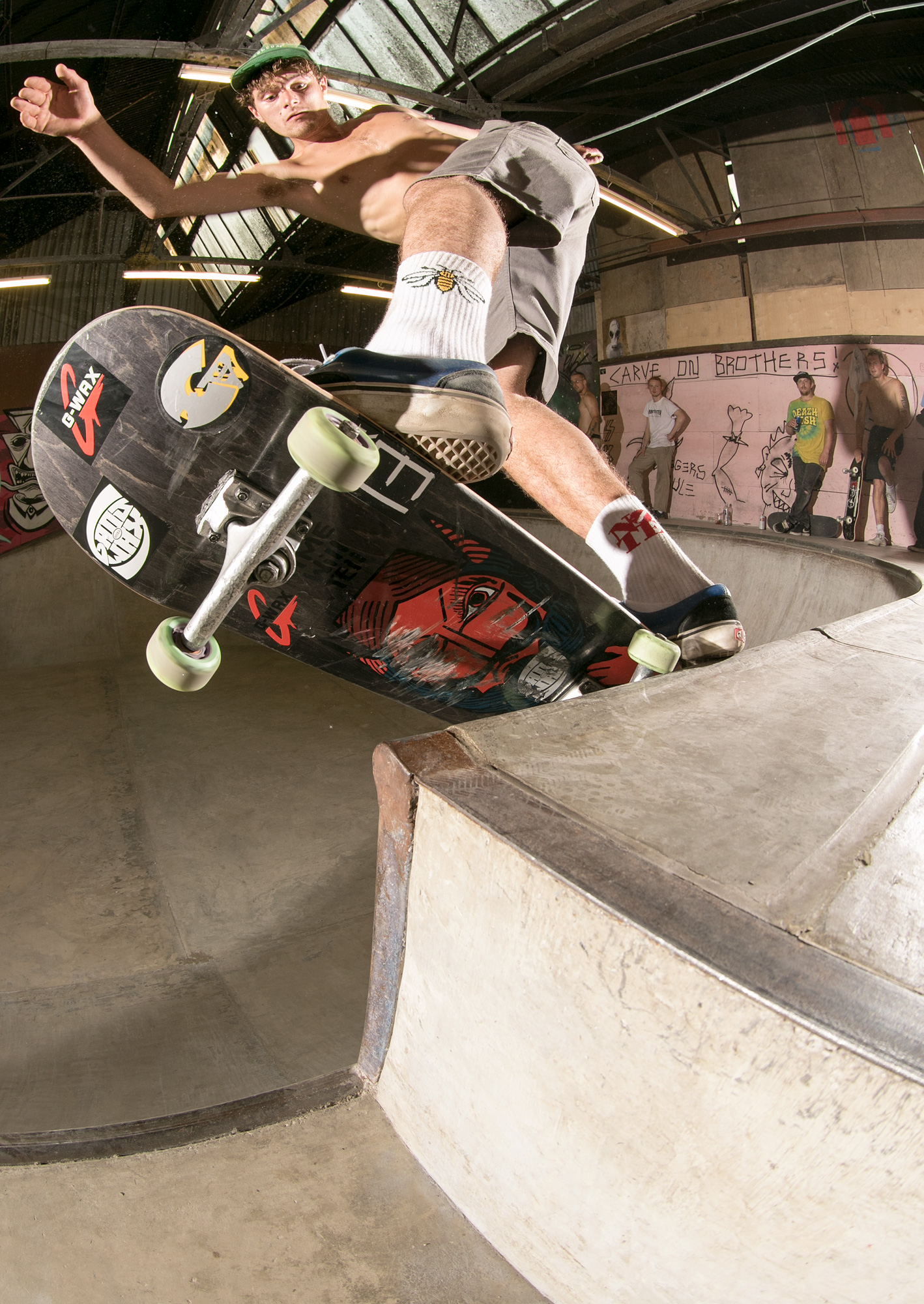 The weather didn’t deter a solid crew from attempting to hurt themselves in the name of skateboarding and the band list was soon condensed and crystallized into Sheffield garage punks Rob & Natas and Leeds-based raging hardcore assault of Hex. Dean Greensmith, Brendan Watson and Jozef Szklaruk fed off the tunes and each other and annihilated every corner of the bowl, somehow without annihilating themselves despite pushing the session to the edge of crash test carnage.