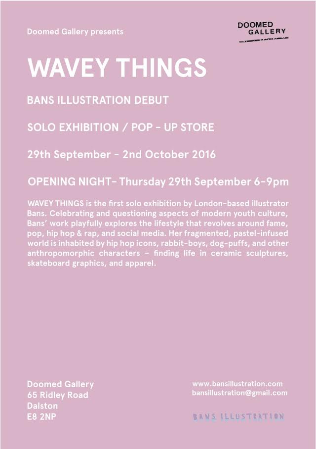 London-based illustrator Bans presents 'Wavey Things' - her first solo exhibition and a celebration of hip hop, skateboarding and fashion opening at the Doomed Gallery...