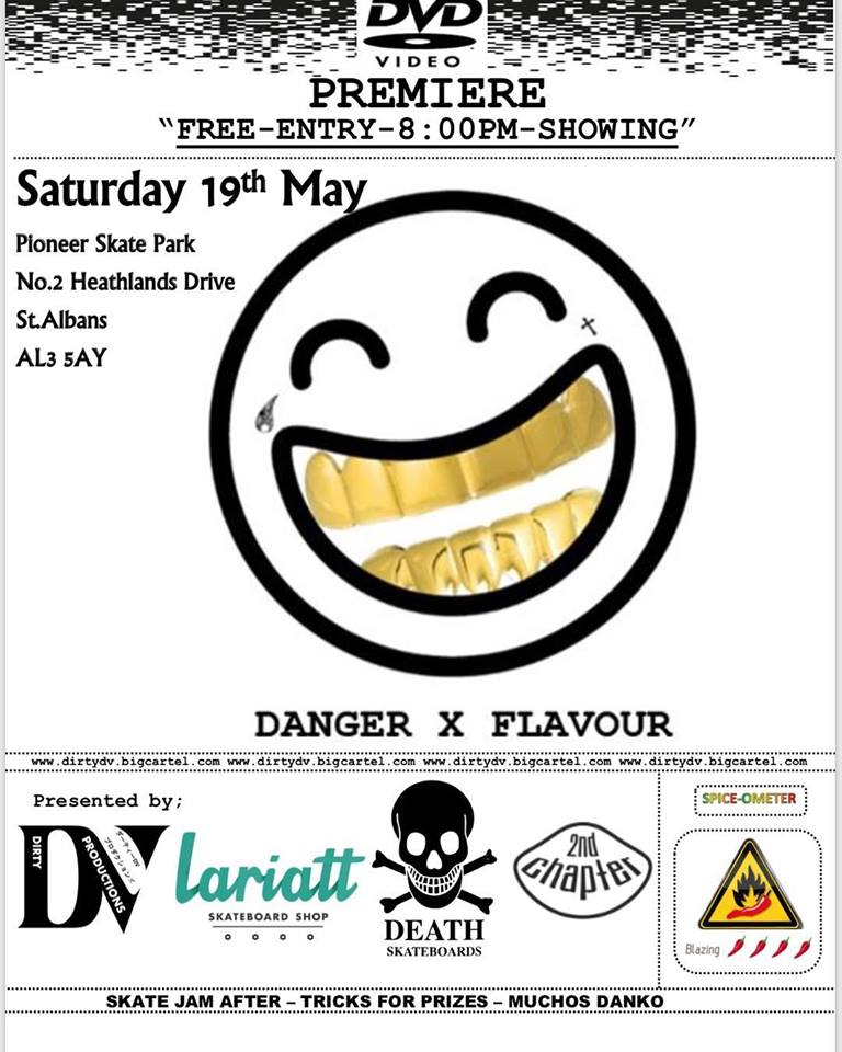 Danger X Flavour Premiere - Mark Radden's full length Essex scene video will be showing at Pioneer Skatepark on Saturday the 19th of May.