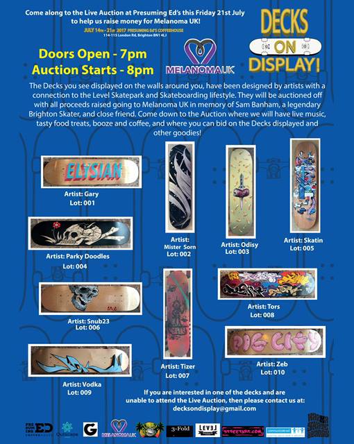 Decks on Display is an auction of boards designed by artists with the aim of raising funds for Melanoma UK, taking place at Presuming Ed's...