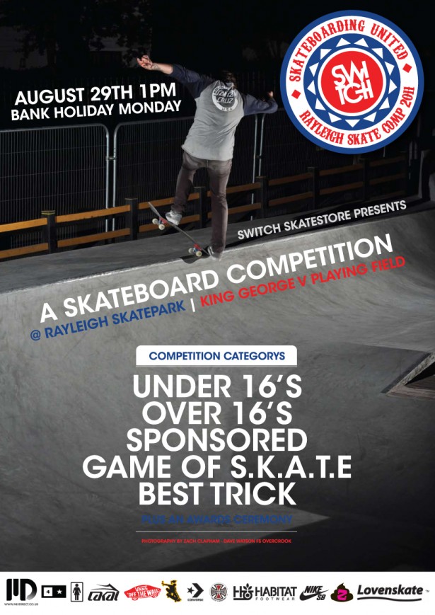 The guys at Switch Skateshop have organised a Bank Holiday comp for the skatepark at King George V Playing Field in Rayleigh, Essex. Head to the park from 1pm on Monday to get involved with Under 16’s and Over 16’s comps, a sponsored comp, game of SKATE, best trick jam and more, with plenty of prizes up for grabs from a whole host of companies.