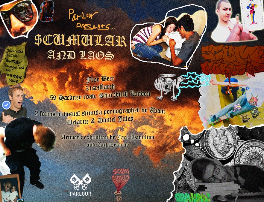 Parlour will be premiering two videos this Friday courtesy of the Scum World crew, Adam Delarue‘s Scumular and Daniel Jules‘ Laos, with an accompanying exhibition featuring the work of Jack Hamilton and Zach Delarue.