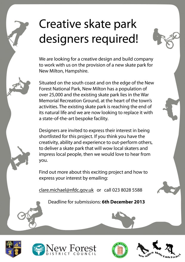 New Forest District Council and The New Milton Skatepark Project are looking to speak with as many experienced skatepark designers as possible in order to make the planned park in New Milton as well thought out and enjoyable to skate as possible!