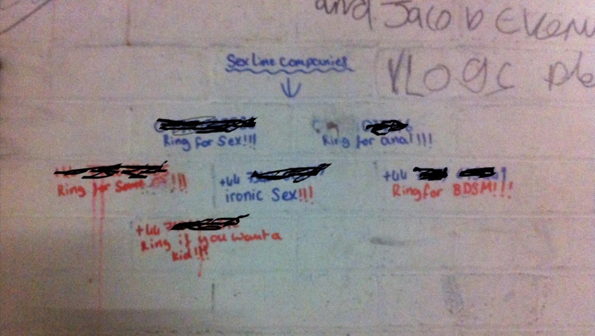 Hello, is that the ironic sex hotline? Boom Skatepark’s sex chat line wall…