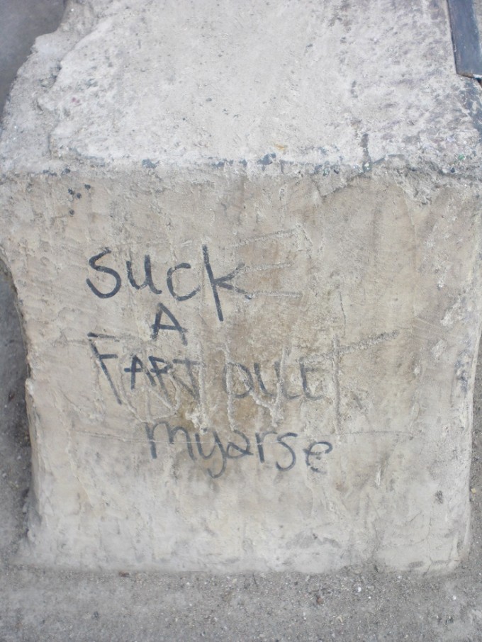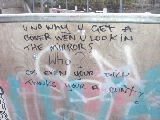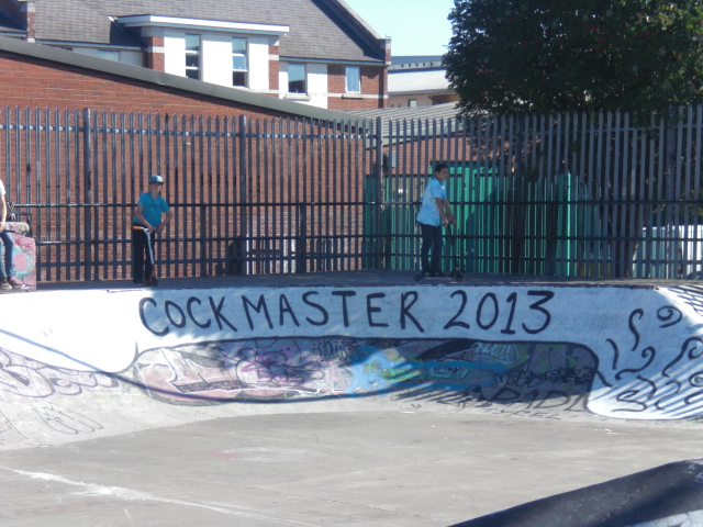 This gives certain events and sights a surreal edge in a manner that would make Spike Milligan proud. A large dollop of childish and overtly offensive humour finds its way across no more than in the graffiti which covers almost every skatepark I have been to. For various reasons, here are some of our favourites skatepark graffiti examples.
