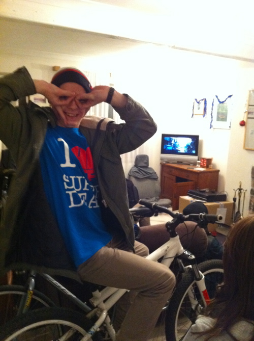 This is a game were if you get caught looking at the person donning the super hero glasses, you have to lie down on the ground no matter were you are. Young Josh Parr is obviously a master at said game.