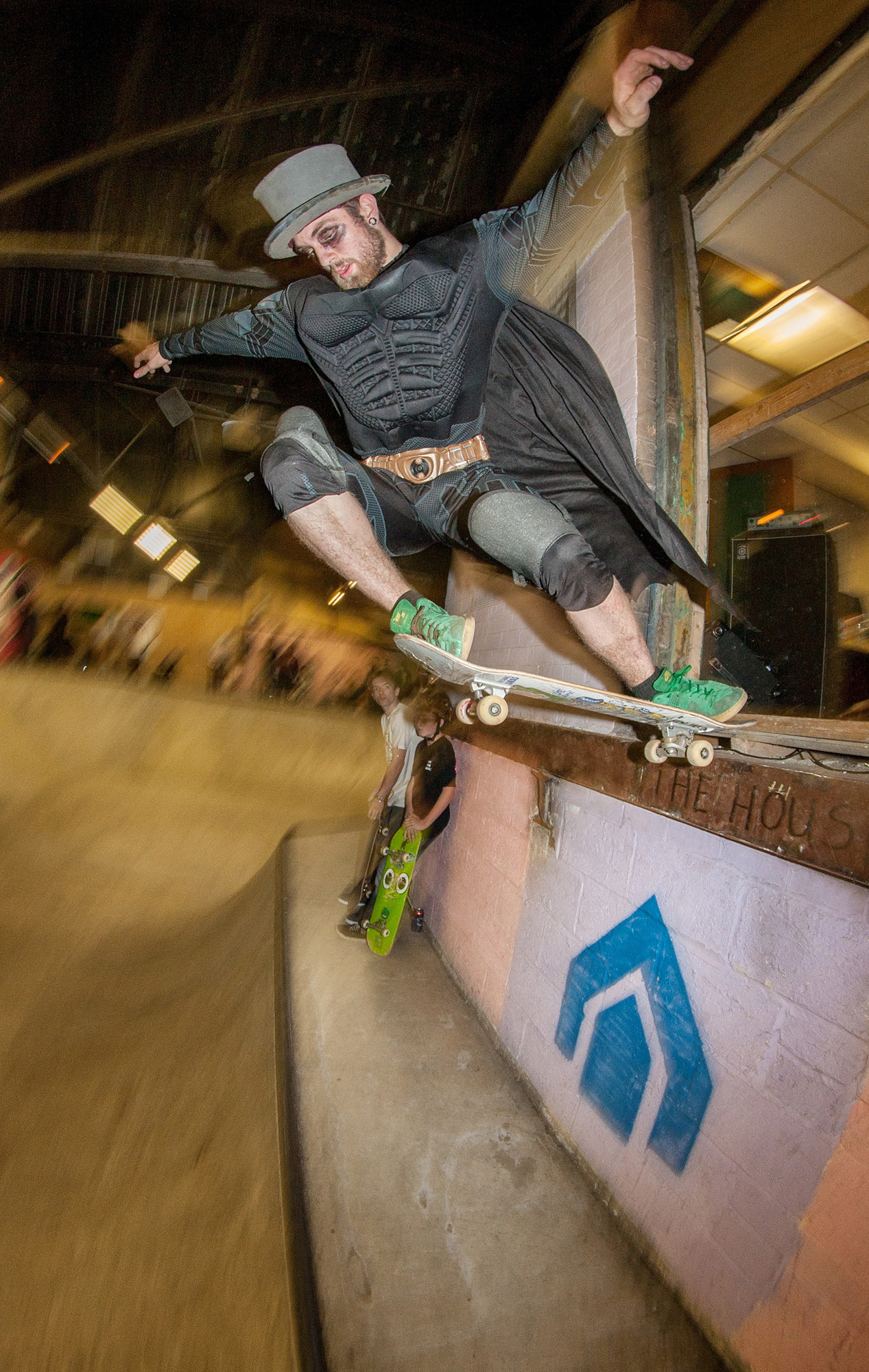 Halloween as it stands today is an American import celebrating all things ghoulish and occult. Developing from the Christian celebration of All Hallows Eve, which itself developed from the Celtic festival of Samhain, it is now an excuse for children to knock at people’s doors and expect to get sweets and for adults to drink their body weight in booze whilst dressed up as a zombie, a vampire or a prime minister being fellated by a pig. It is also an excuse for skateboarders to put on jams, a tradition which experts believe began at the pagan sacrificial altar of Burnside, Portland. While many UK indoor skateparks put on skate events on the Saturday which Halloween fell on this year, we were happy to find ourselves laying trucks to ‘crete at The House Skatepark in Sheffield where a relatively new ritual site/bowl sat and cried out for a bloodletting.