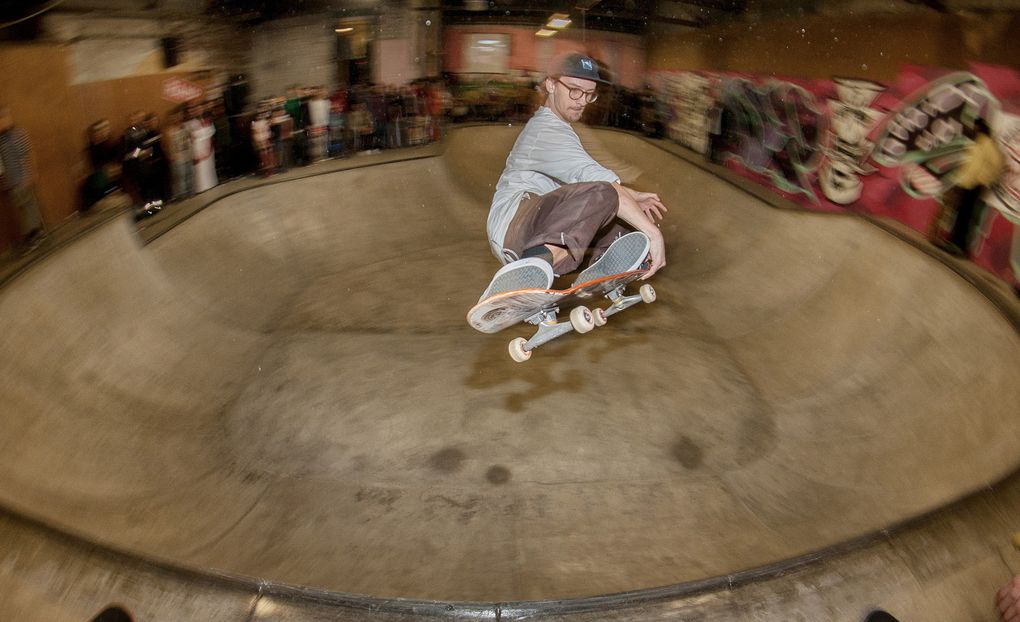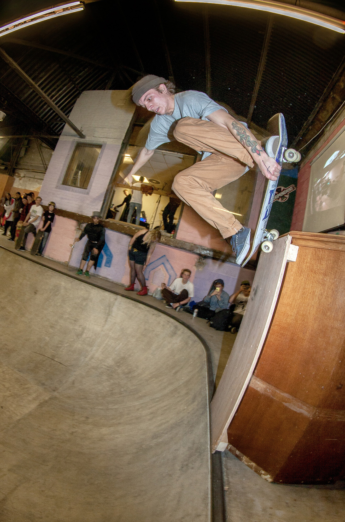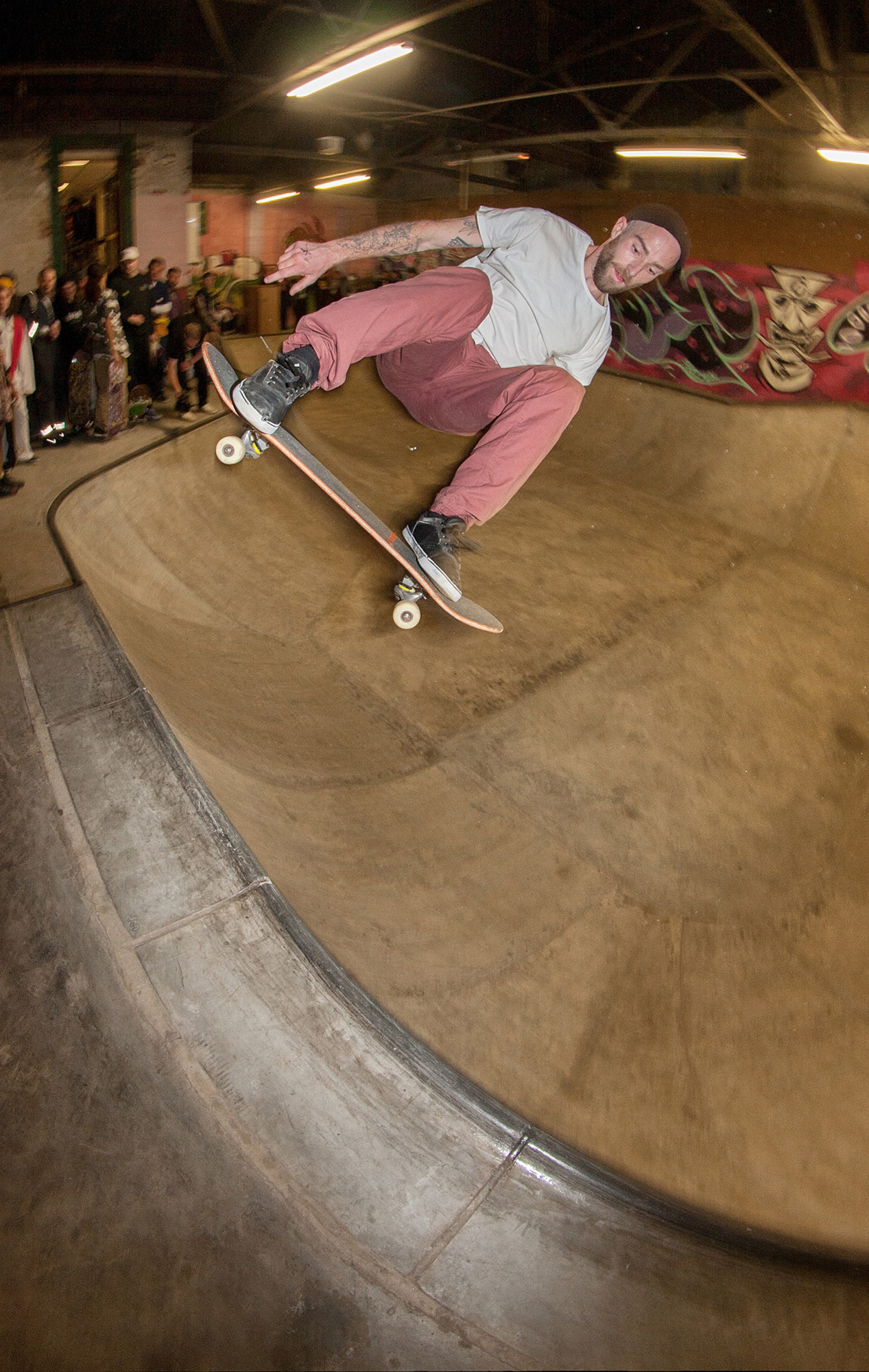The rest of the night goes off without any particularly grim slams, a surprise given the shit that people were throwing themselves at. Ryan goes backside at the tombstone for the mirror image of Potter’s nosepick, while Blinky becomes the first to hit the ledge which leads into the ‘gig’ room (watch the footage for clarification) – taking inspiration more from Andy Roy than Scott Bourne with a rock melon grab down to rock. Meanwhile, Dean Greensmith has been slowly building up more and more momentum with each run and is now absolutely charging through massive tweaked airs over the hip, full speed back crails or switch front rock slides across the deep and frontside wallrides out of the shallow end pretty much every go. He can’t quite stick a 540 ollie over the hip but with the bag of tricks already behind him he’s the obvious choice for first place in the jam, taking home 300 party tokens with Sam Pulley and Ryan Price taking second and third respectively. Meanwhile, the best trick cash is shared between Blinky for his rock melon to rock and Ryan for his backside nosepick.