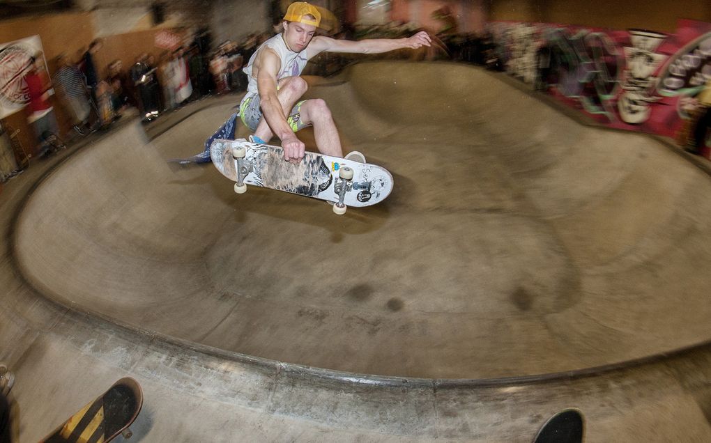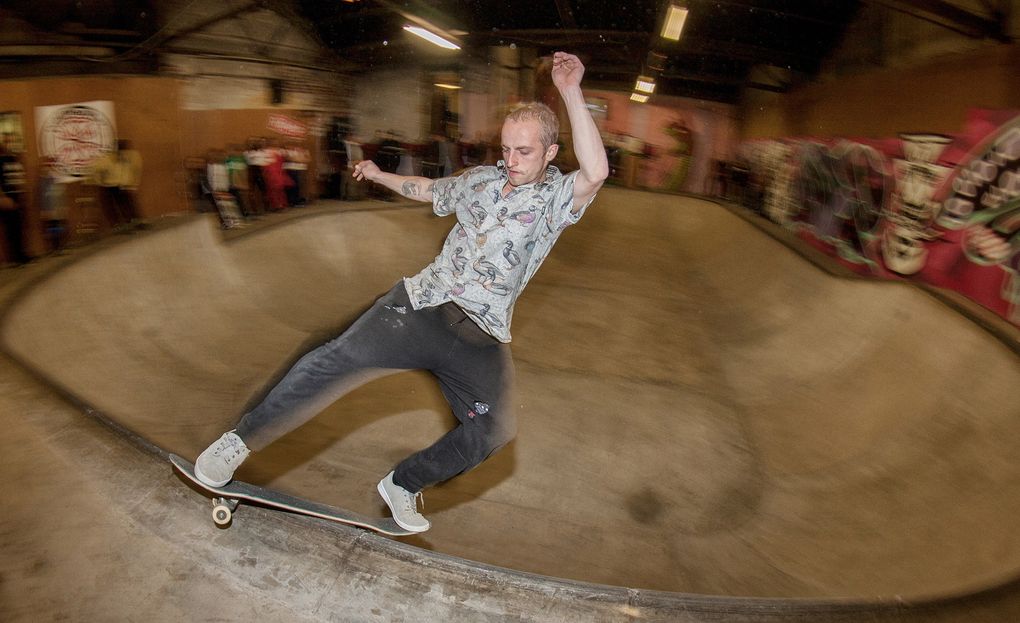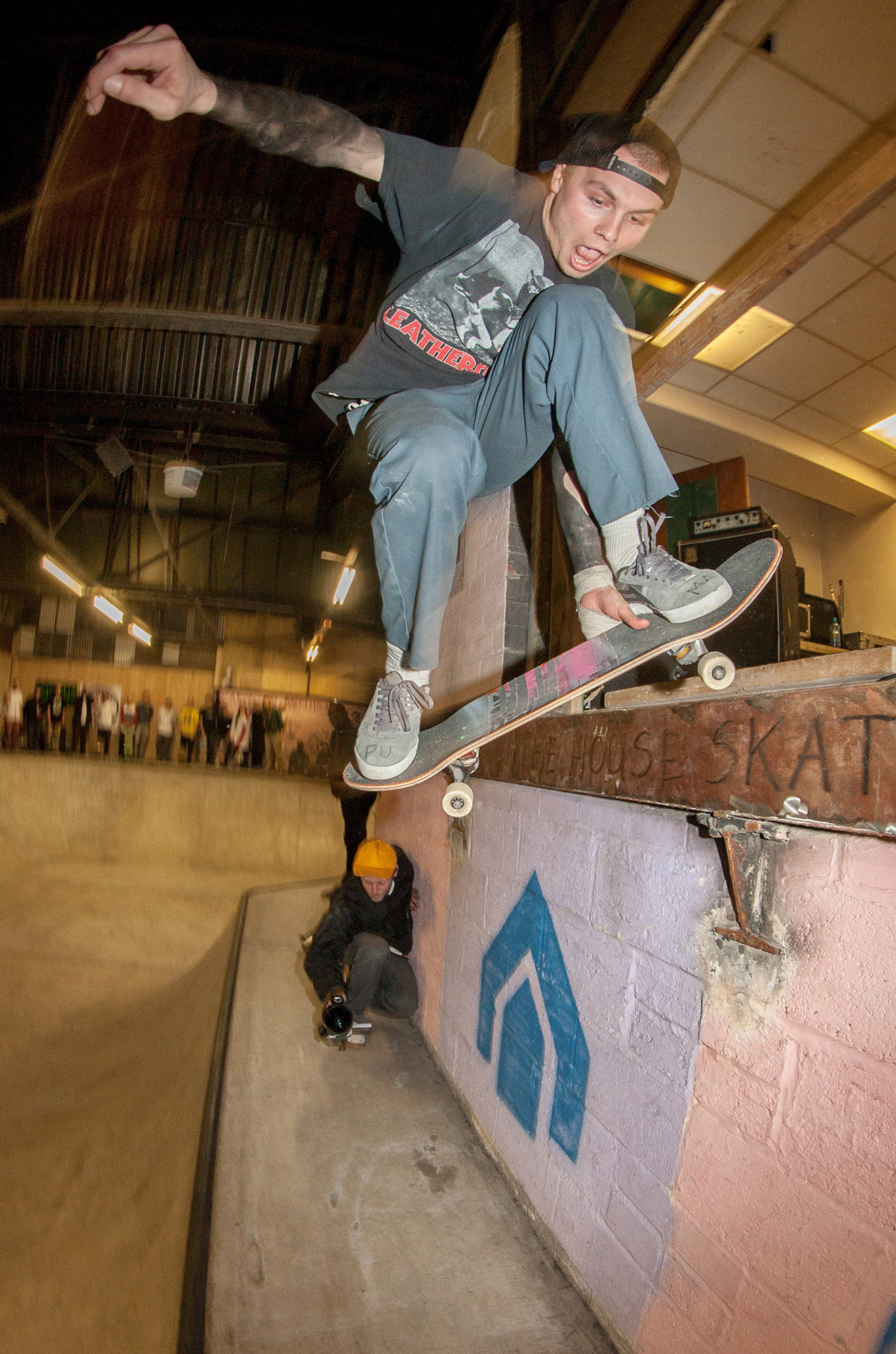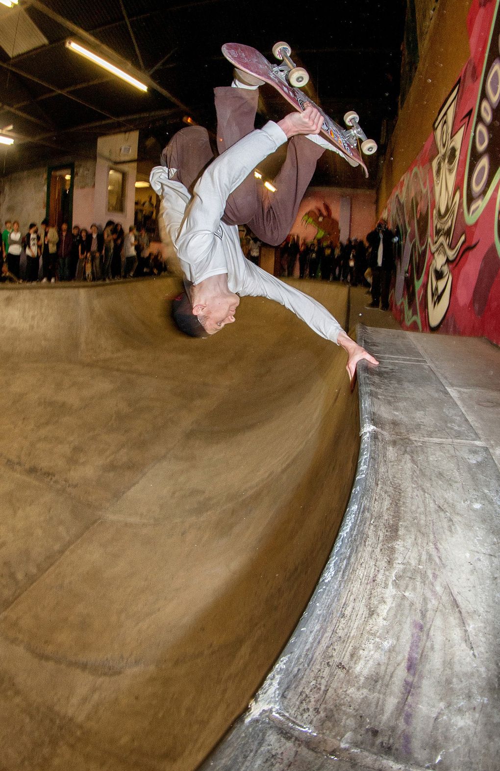 The rest of the night goes off without any particularly grim slams, a surprise given the shit that people were throwing themselves at. Ryan goes backside at the tombstone for the mirror image of Potter’s nosepick, while Blinky becomes the first to hit the ledge which leads into the ‘gig’ room (watch the footage for clarification) – taking inspiration more from Andy Roy than Scott Bourne with a rock melon grab down to rock. Meanwhile, Dean Greensmith has been slowly building up more and more momentum with each run and is now absolutely charging through massive tweaked airs over the hip, full speed back crails or switch front rock slides across the deep and frontside wallrides out of the shallow end pretty much every go. He can’t quite stick a 540 ollie over the hip but with the bag of tricks already behind him he’s the obvious choice for first place in the jam, taking home 300 party tokens with Sam Pulley and Ryan Price taking second and third respectively. Meanwhile, the best trick cash is shared between Blinky for his rock melon to rock and Ryan for his backside nosepick.