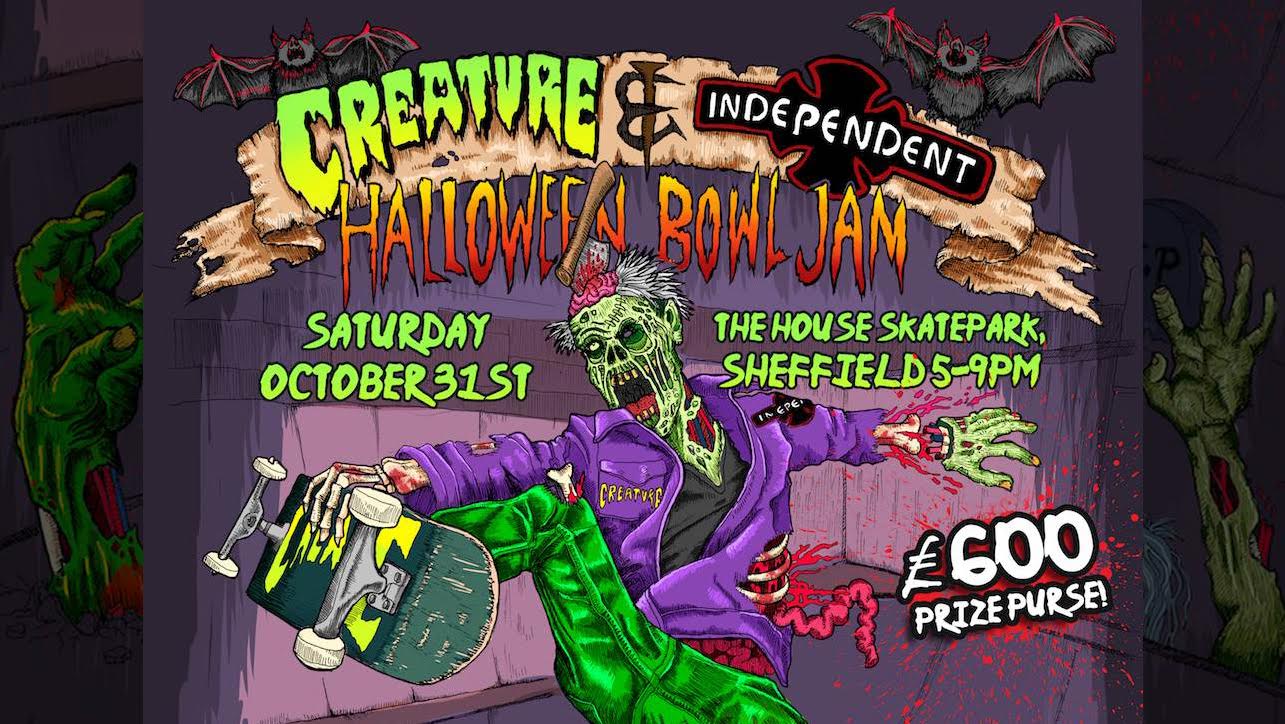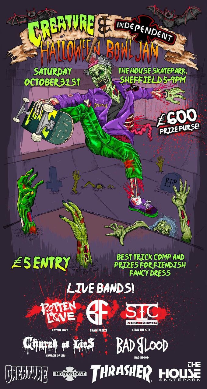 The House Skatepark in Sheffield will see things getting gnarly this Halloween, with a massive bowl jam sponsored by Creature Skateboards and Independent Trucks and bands playing on the night. If you haven’t been yet the bowl is incredible, the whole park has a good vibe and this event is bound to bring some rippers out of the woodwork. Check the flyer below for details, the Facebook page for updates and scroll down to watch what went down at last winter’s event…
