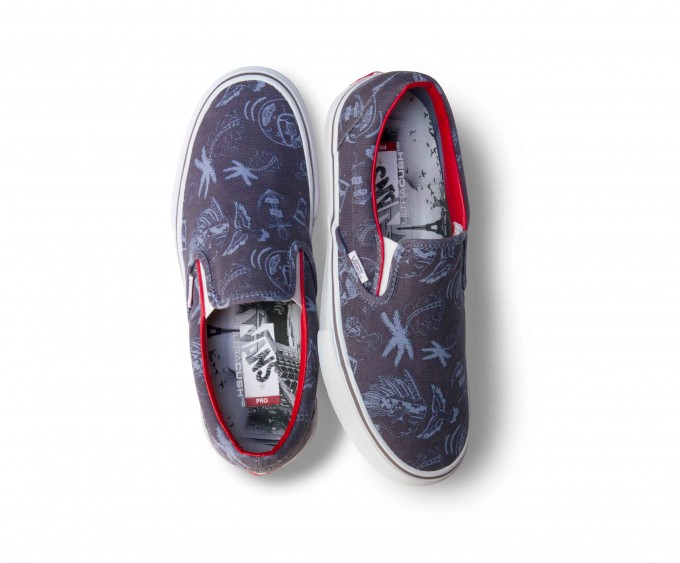 Completing the offering, Sam’s Slip-On Pro is joined by a t-shirt: Vans’ staple Custom Fit tee, with a photographic print of Sam’s work across the chest, complementing the shoe.